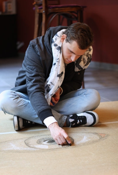 Lander Daniësl was aan het werk in de winkel Anders Getint in de Dietse straat. Hij studeerde illustratie en beeldverhaal aan het Sint-Lucasinstituut te Brussel, doet nu zijn master. Zijn droom is les te geven en tevens ook te werken als illustrator. Voor zijn raamtekening maakte hij een voorontwerp. Een drietal uurtjes vergt het tekenen van het ontwerp op het winkelraam. Info: daniels_lander@hotmail.com