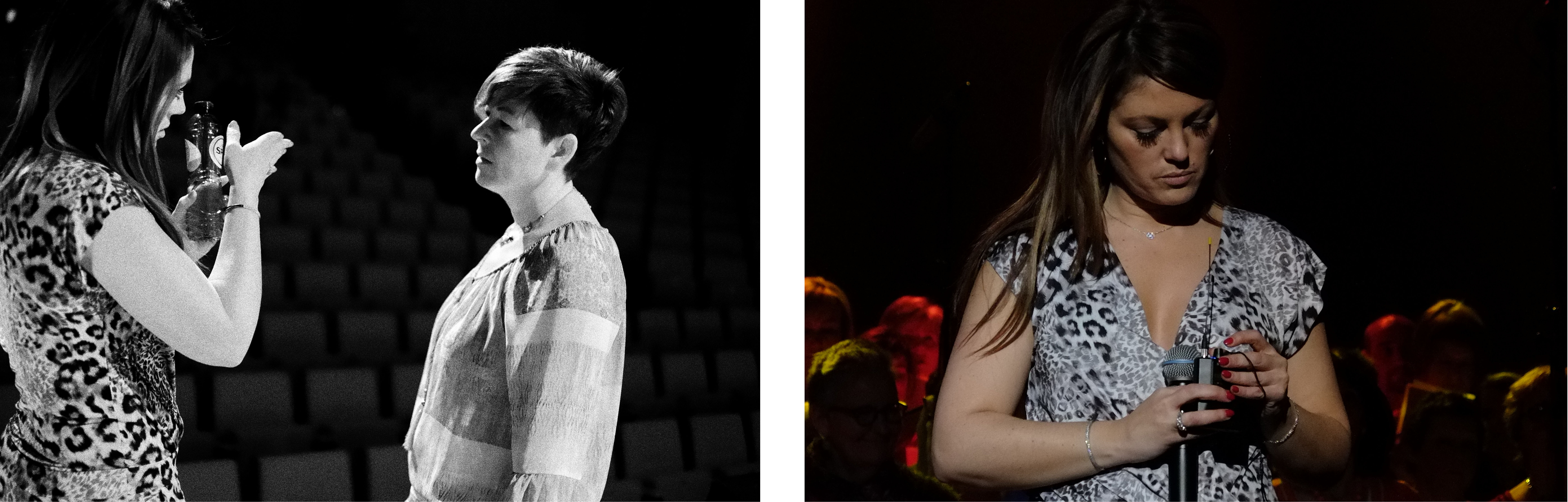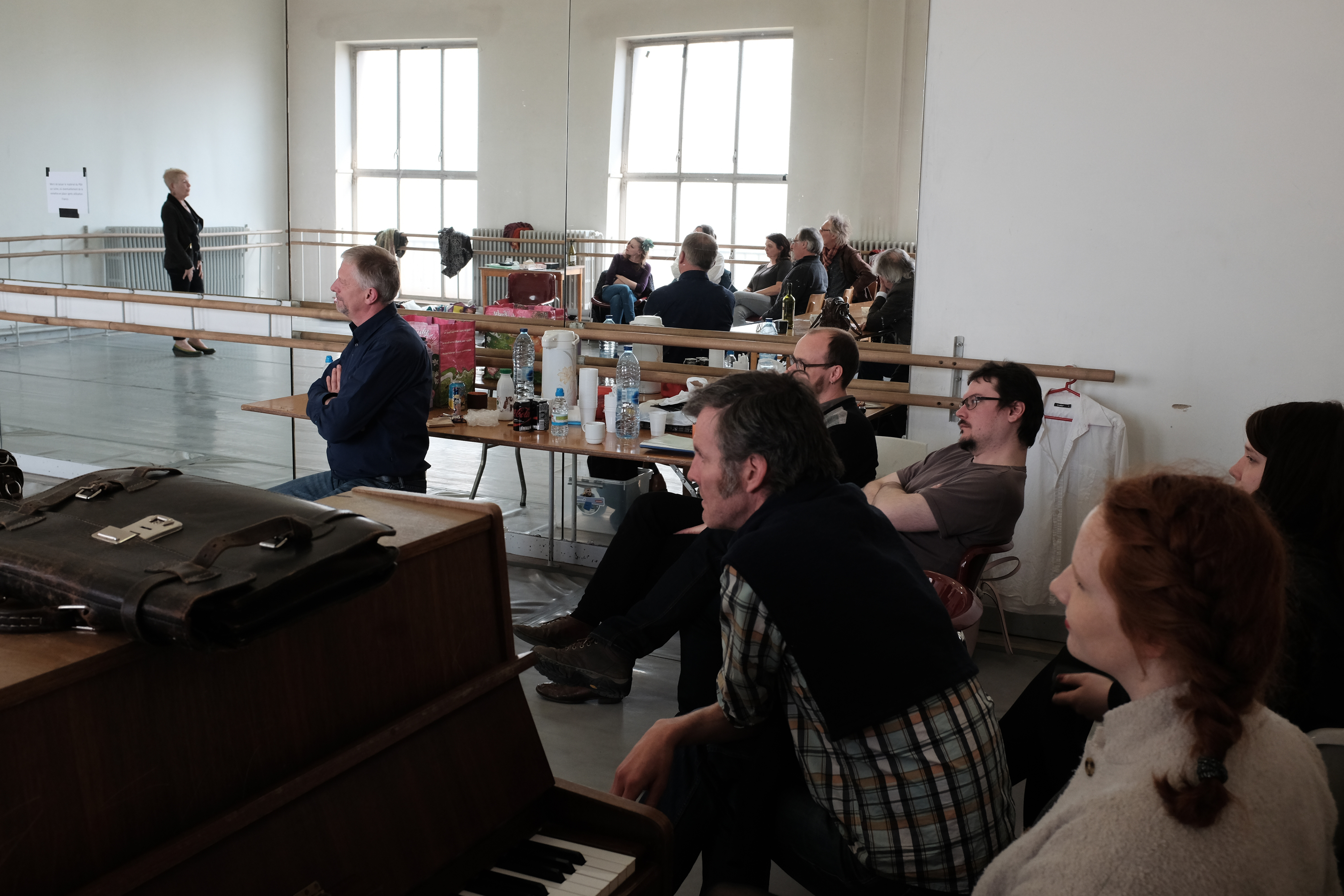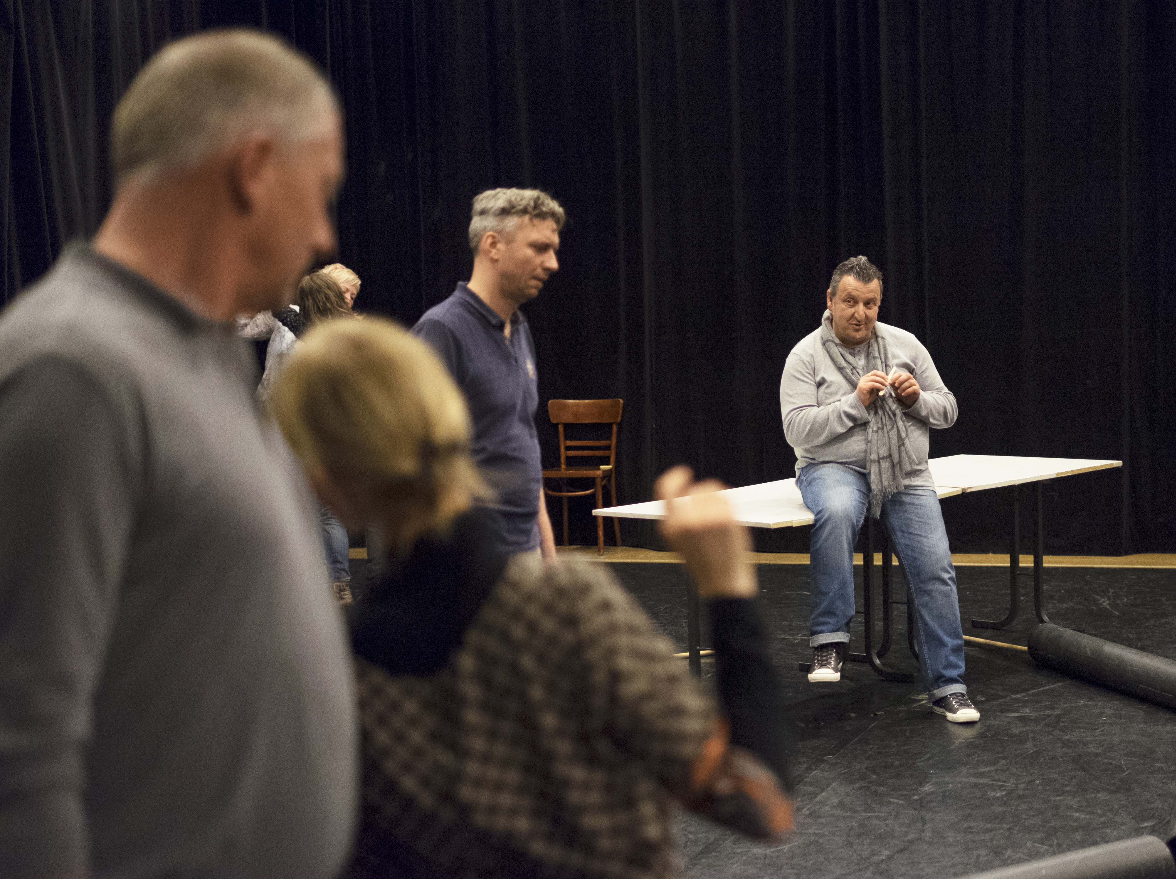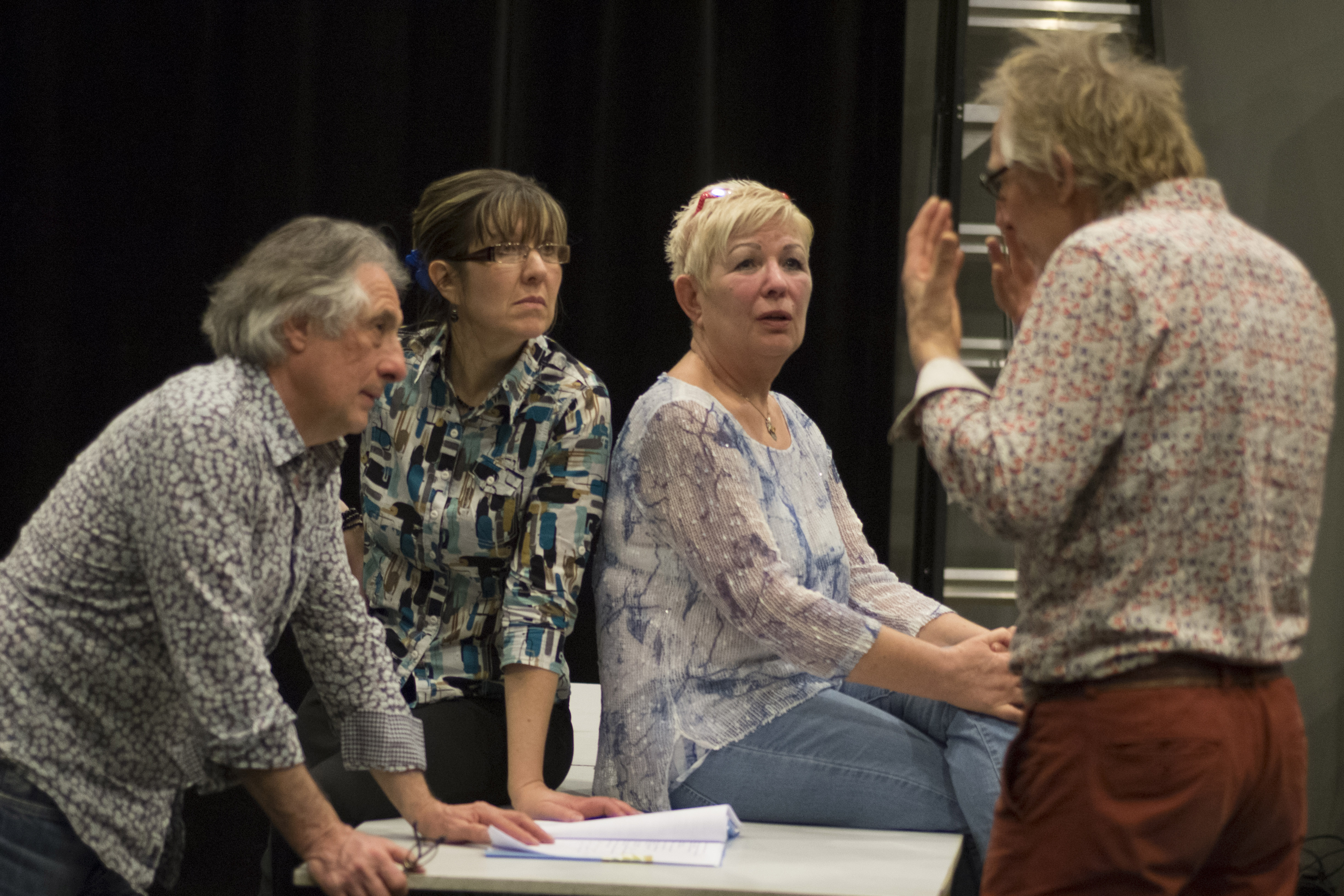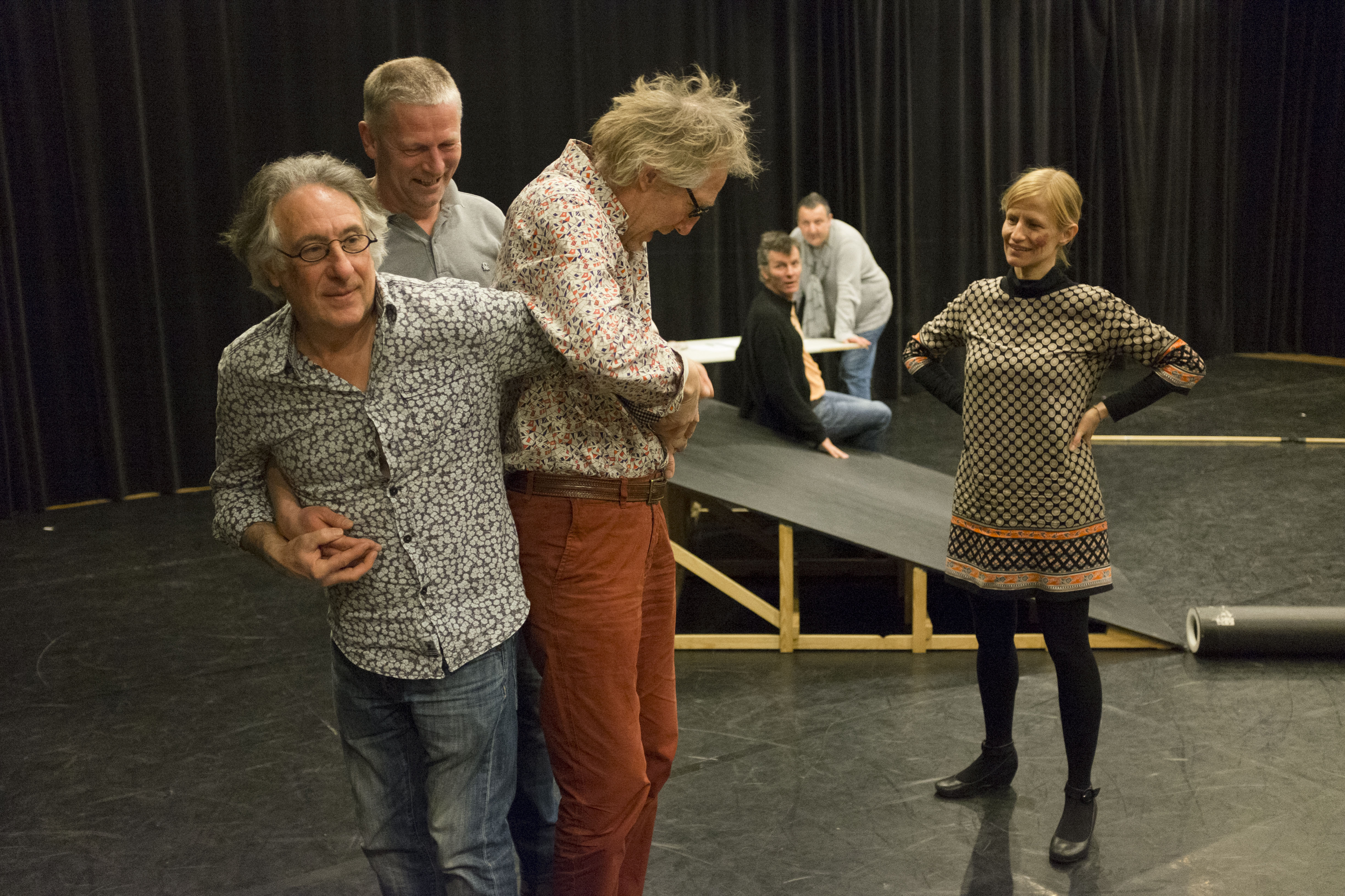 Philippe en Patrick kijken nauwlettend op alles toe. Op de beweging, hoe de acteurs naar elkaar en naar het publiek kijken., in het stuk wordt een scene met twee of drie acteurs gespeeld. Maar de anderen blijven op de scène en die moeten ook het passende gedrag vertonen. Dat kan dat van een voyeur zijn of van iemand die totaal onverschillig is. Wanneer ze niet repeteren schrijven de acteurs op waar ze moeten op letten. De regisseurs zeggen, met een glimlach, dat ze niets noteren. Is het waar? Men weet het niet.