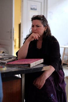 Ik bewonder haar veelzijdigheid: fotopolymeer, zeefdruk… Katelijn Lammertyn experimenteert graag. Toeval speelt vaak een rol. Inktvlekken, resten inkt, frottages, afval… kunnen leiden tot nieuw werk. Vroeger werd er gedrukt op afvalpapier nu kiest ze liever voor zuurvrij papier zoals Fontenay Canson papier, Zerkall.