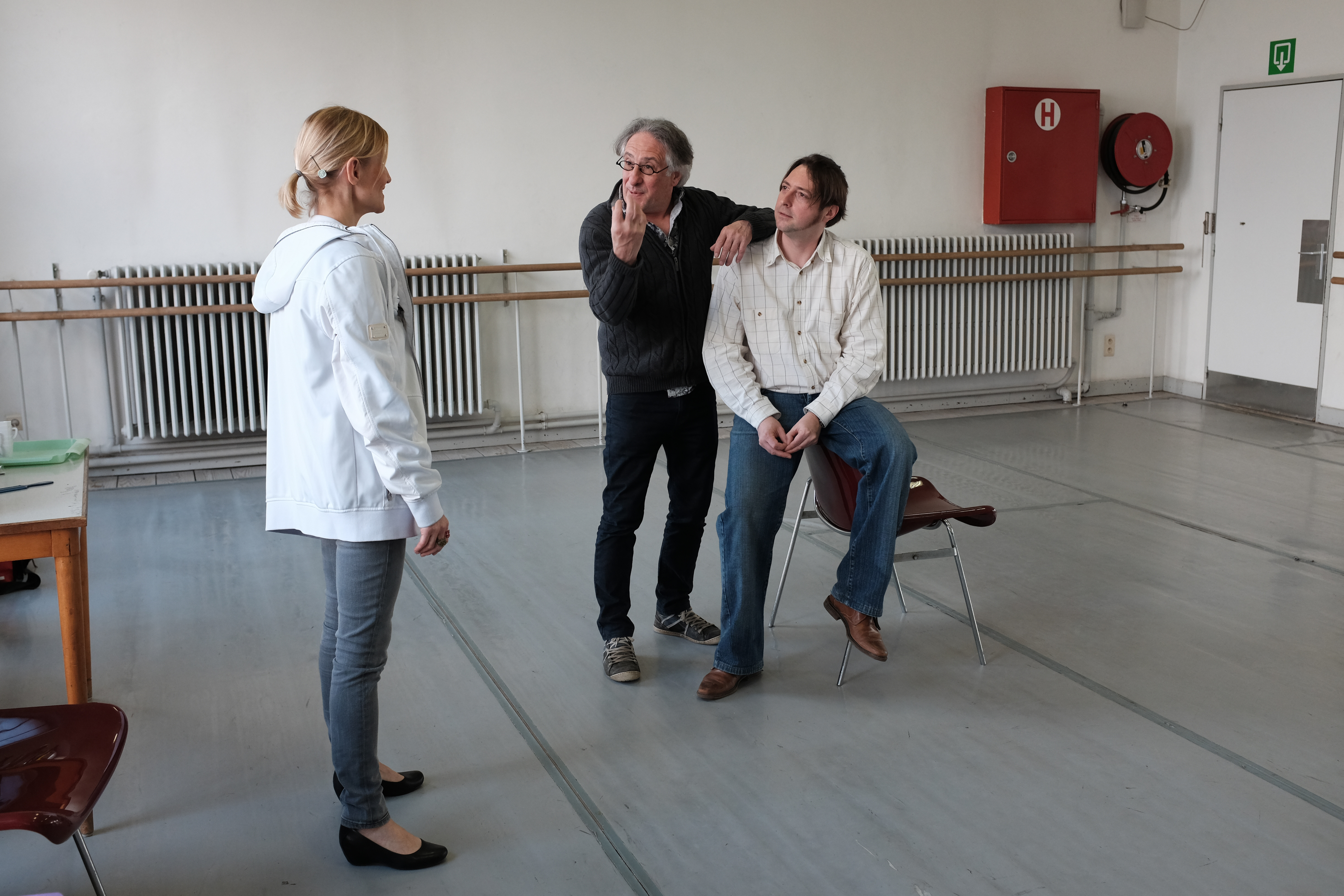 Patrick: We discussiëren nooit als de acteurs er bij zijn. Dan denken we op een bepaald moment: “Hola ik zwijg nu.” Dan komt Philippe bijvoorbeeld zeggen: “Patrick heb jij gezegd dat dat moest geschrapt worden?” Bijvoorbeeld die vest, ik zal je een fragment geven. Die vest werd gisteren, tijdens de repetitie gegooid. En zij gooit die vest, maar Fabien moet normaal zeggen: “Trek mijn vest uit!” Die zin kon hij niet zeggen omdat zij zo organisch speelde dat ze haar vest uittrok en onmiddellijk naar hem gooide. En die zin was weg. Oke nu spelen ze dat opnieuw zonder die zin en Philippe komt naar mij: “Patrick die zin is weg, heb jij dat gezegd?” En dan heb ik gezegd tegen Philippe: “Ja gisteren is het organische bespeeld geweest”. “Ja maar dan moeten we nu goed afspreken: ga je die zin er in laten of ga je die zin er niet in laten?”
