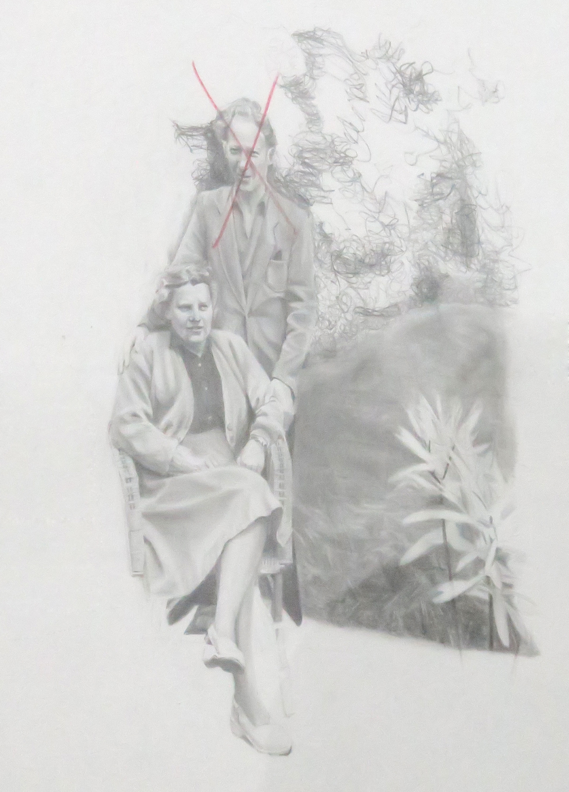 Realistisch getekend met een persoonlijke toets en/of boodschap. Het rode kruis geeft een nieuwe dimensie, letterlijk en figuurlijk, aan de tekening. Voor interpretatie vatbaar.