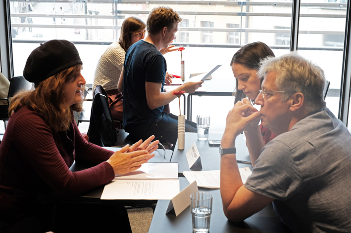 De bedoeling is de collage aan te vullen met zinnen die zomaar opborrelen, freewriting. Een heerlijke meditatieve stilte getuigt van de concentratie bij de deelnemers. Hier worden grenzen verlegd. Een creatieproces is in gang gezet.