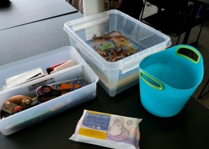 Boxen met kleurtjes, krijtjes, lijm, spatel, babydoekjes, tijdschriften, dobbelstenen…. nodigen uit creatief aan de slag te gaan.