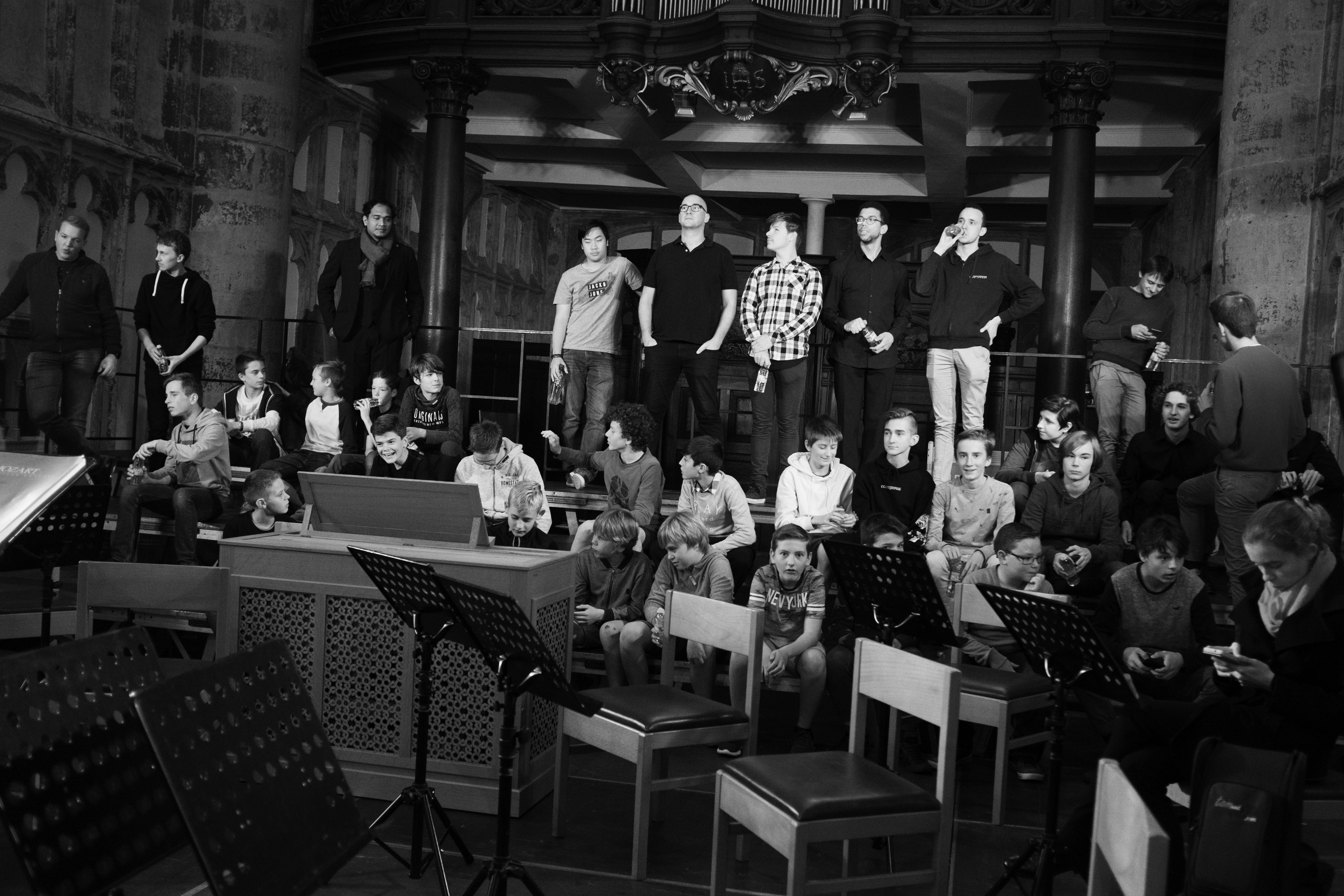 De dirigent stemt het orgel. Wanneer hij opmerkt dat hij een beetje laat is, rent hij naar een ander gebouw, “het gebouw van de nonnen”. In een grote ruimte is het 50-koppige koor zich aan het voorbereiden. De dirigent moet snel zijn kostuum aantrekken, de jongens zijn al klaar. Ze spelen met hun telefoon en tegelijk discussiëren ze met elkaar. Er is veel geroezemoes. Voor Vic, één van de knapen, is het zijn eerst concert. Hij ondervindt een beetje stress. “Het zal goed gaan denk ik. Met het orkest denk ik wel dat het ook goed zal gaan. Hier en daar moesten wij iets aanpassen, dat is normaal.”
