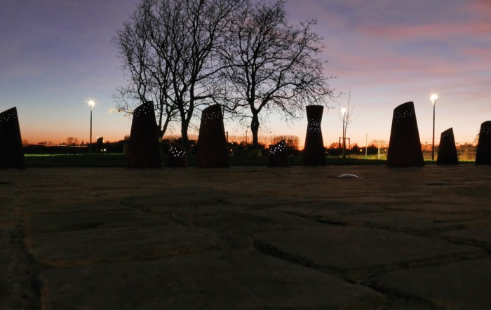 Martine Platteau Het bestuur van Sint-Baafs-Vijve/Wielsbeke schreef een wedstrijd uit. Ze zochten een creatieve oplossing voor parkeerpaaltjes op het vernieuwde centrumplein. Dit plein is gelegen aan de groene boorden van de Leie. De installatie moet verhinderen dat auto’s parkeren op de groene zone. Hun voorkeur ging uit naar mijn concept omdat ik refereer naar de vroegere vlasnijverheid in de streek. Het ontwerp bestaat uit stalen vormen geïnspireerd op ‘vlaskapellen’. De blauwe verlichting die door vele gaatjes bovenaan de vorm uitstraalt, refereert naar de vlasbloem. Deze 48 ‘Vlaskapellen’ betekenen respect voor het harde werk van de bewoners in de vlasteelt.