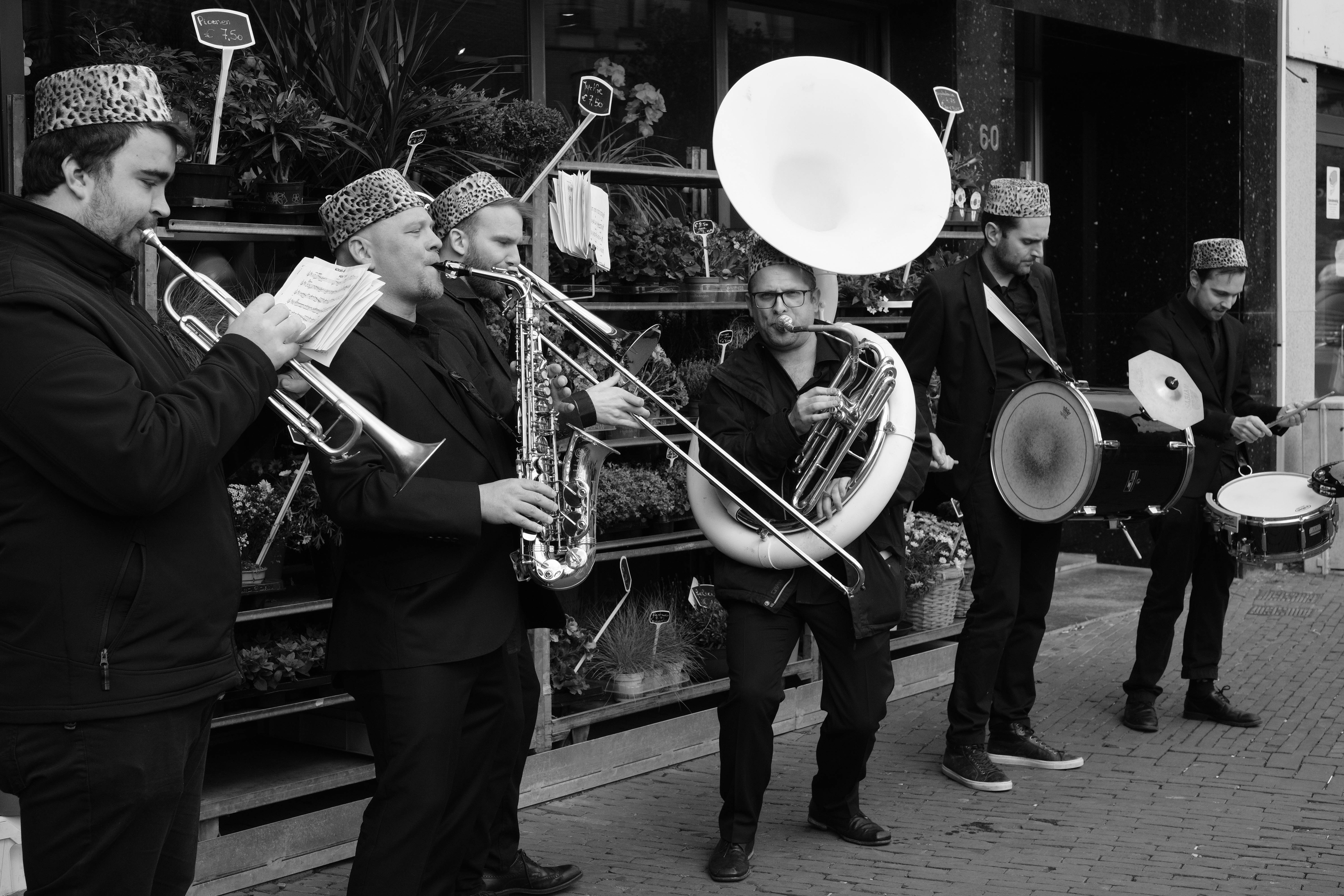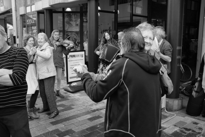 Verderop in de straat, aan de ingang van de gaanderij naar de Collegestraat, speelt een groepje muzikanten. Dit optreden is niet terug te vinden in het officiële programma. Sfeer ontbreekt hier echter niet. Voorbijgangers houden halt om te dansen. De regen wordt verlegen bij het aanschouwen van dit vrolijke spektakel.