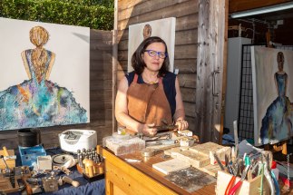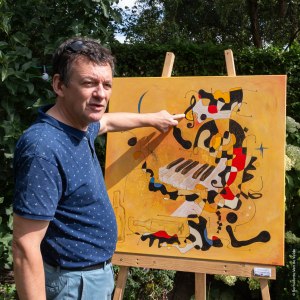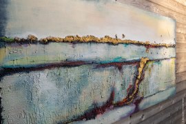 Buiten wacht me een grijze regenbui. Gelukkig, de warme ontvangst door de kunstenaars en het heerlijke kleurenspel van hun schilderijen kunnen de pret niet bederven.