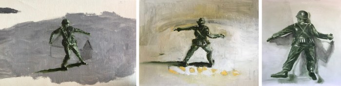 Deze serie gaat over perceptie: wat zie ik? Hoe ga ik daar met om? Ik zie een soldaat, toch zie ik ook dat het om speelgoed gaat. We maken m.a.w. ons object, door ons subject. De kleur, de vorm en enkele kenmerken zijn voldoende om ons te leiden, ook te misleiden. Het is een bewuste Vertraging, een stopzetten van Tijd. Alle aandacht gaat naar het Nu moment: het gevallen speelgoedsoldaatje.