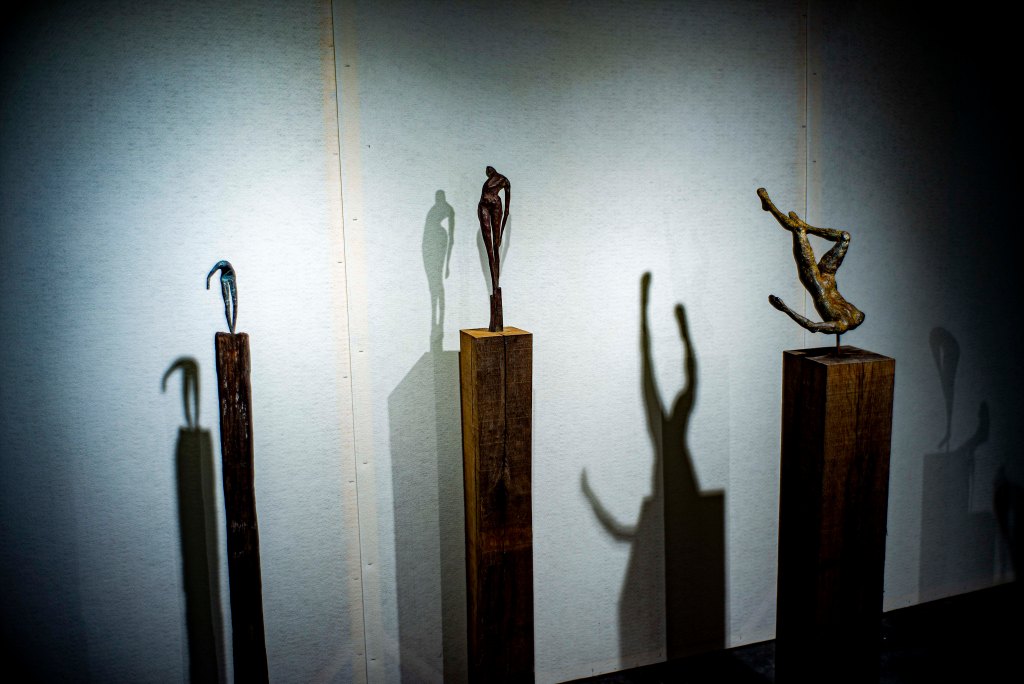 “Dat is heel onbewust. Het heeft met de sterfelijkheid te maken… beelden die niet af zijn hebben dikwijls een zekere tristesse. Soms is dat bewust hoewel ik geen droevig persoon ben. Het leven is wat het is en als je je ouders verliest, is dat een periode waar je met je voeten meer op de aarde terechtkomt. Waarom zou ik een gave figuur maken, niemand is perfect. De arm moet er niet aan maar in mijn hoofd zie ik die arm wel, voor mij hangt die daar aan. Er zijn er een aantal die vallen. Er zijn er een aantal die een sprong maken. Waar ze eindigen weet ik ook niet.”