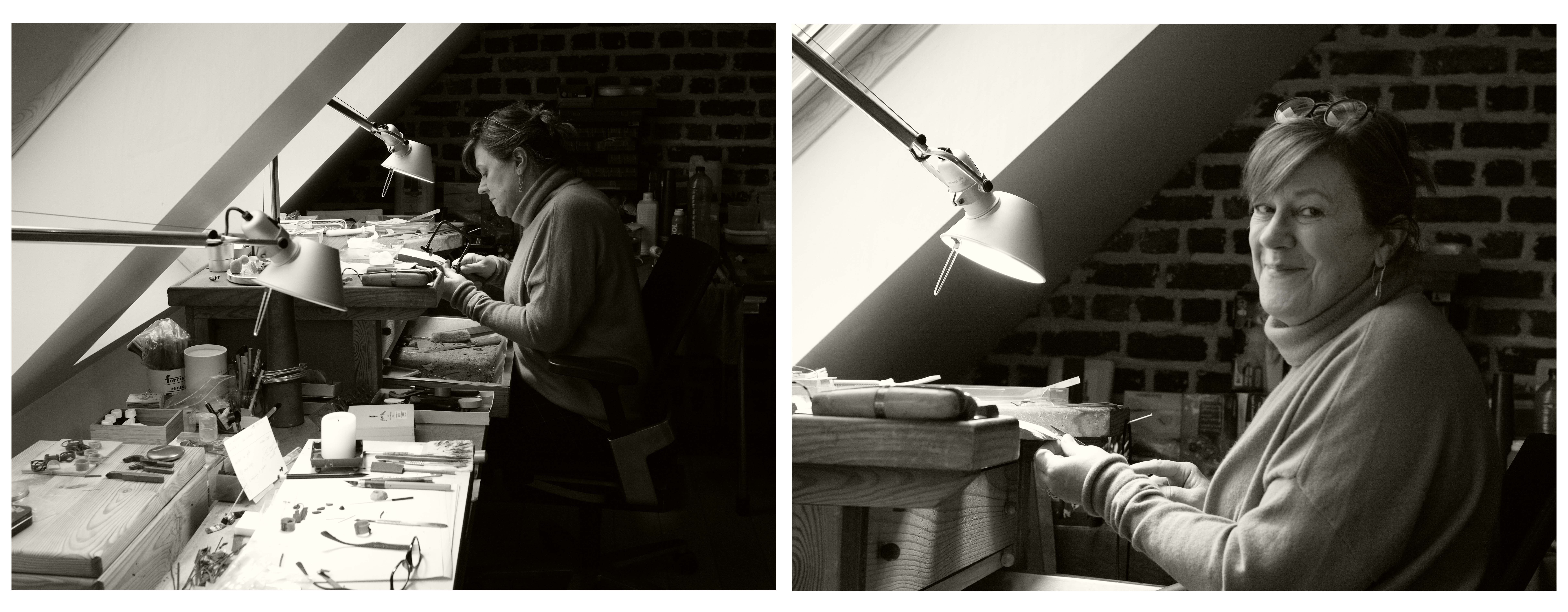 “Ik vind het enorm boeiend. Je weet voor wie je werkt, over wie en wat je aan het nadenken bent. Kinderen, partner, het overlijden van familieleden kunnen aanleiding zijn tot een juweelontwerp. Het is fijn dat me gevraagd wordt iets te maken met een speciale betekenis: voor geboortes, zovele jaren samen zijn tot voor opgroeiende kinderen, dochters die volwassen worden, alles kan. Ik zie vele levensverhalen passeren, van alle generaties, zeer jong tot heel oud, dat maakt het voor mij boeiend, houdt de passie levendig. Ik ben altijd met een juweel bezig en elk verhaal dat ik verwerk is anders. Reeksen ontwerpen om te verkopen in winkels, betekent productie, want je moet leven, een inkomen hebben. Verkopen is voor mij niet het belangrijkste. Ik wil gepassioneerd bezig blijven en voeling hebben met mijn klanten.”