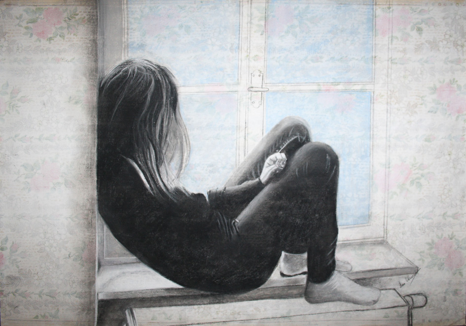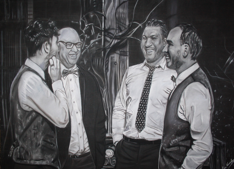 Totaal anders is het werk in zwartwit van vier mannen in gesprek. Ze tekende het snel, op basis van een kleurenfoto, op vraag van collega’s van een pas overleden man. Het lijkt wel een frame, geplukt uit een verhaal van Rinus Van de Velde. De verscheidenheid van haar werk is grenzeloos. ‘Meisje aan het raam’ en ‘Lonely bubble’ zijn heel subtiel, suggestief, breekbaar…vrouwelijk zou ik willen zeggen, als dat in tijden van woke-moraal en gendergelijkheid nog is toegelaten.