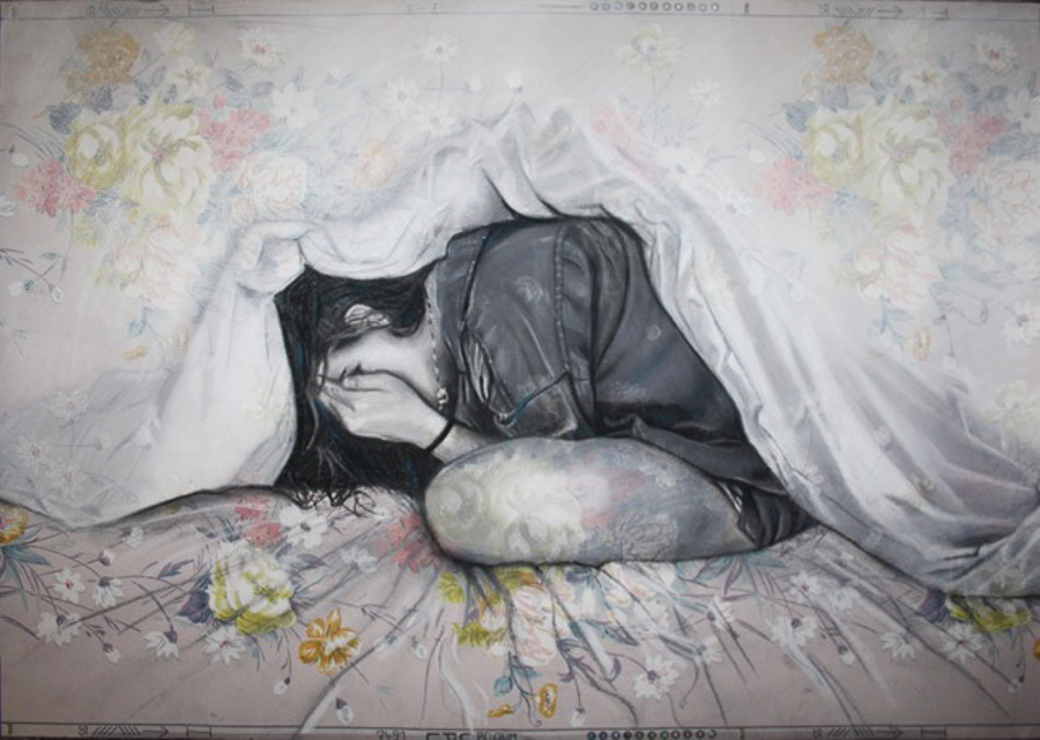 “Ik teken voor mezelf”, zegt Leen. “Op die manier kan ik de dingen van me afzetten. Ik heb behoorlijk wat meegemaakt in mijn leven, dat is privé, maar ik ben heel gevoelig voor stemmingswisselingen.” Ze ervaart momenten van grote eenzaamheid, zegt ze, soms diepe droefheid, ontgoocheling ook, afgewisseld met opwellingen van intense blijdschap. Tekenen is haar uitlaatklep, het geduld dat ze er moet voor opbrengen werkt kalmerend, het resultaat is emotie, beheerst, zacht en kwetsbaar. Ze toont een werk dat ze maakte tijdens de coronacrisis, een huilende vrouw gezeten in het hoekje van de douche. “Mensen spraken er mij op aan”, zegt ze, “vrouwen die misbruikt waren geweest, hoewel dat nooit de bedoeling was van mijn tekening. Maar emoties zijn nu eenmaal heel persoonlijk”.