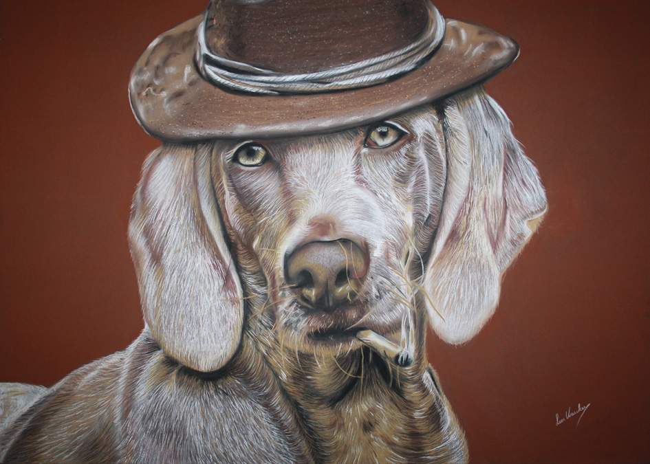 Hyperrealistisch pastelwerk zoals van Francesco Ipsan of Clare Zhao moeten we van Leen Vereecken dus niet verwachten, hoewel ik er zeker van ben dat ze het zou kunnen. “Heb je een speciale affectie voor honden, katten of paarden?” wil ik weten, omdat veel van haar werk daarover gaat, “Neen” antwoordt ze, “dat zijn allemaal opdrachten”… Of toch bijna, er zitten twee honden bij die mijn sympathie wegdragen, door de manier waarop ze me aanstaren. De hond met de hoed op en een sigaret in de muil ziet er even vrolijk uit als Herman Brusselmans en de andere in clair-obscur spreekt Westvlaams: “Wuk?!” Dan valt mijn oog op een tekening van drie struisvogelkoppen. Ze doen me denken aan een confrontatie met die beesten in een natuurparkje twee jaar geleden. Daar stond een hok met een groot gat op een meter of 2 hoog. “Wat zou daar in zitten” hoor ik mezelf nog denken en een seconde later kwamen daar plots zo’n 3 domme koppen naar buiten piepen, net zoals op de tekening. Het zijn tekeningen die Leen uit zichzelf maakte, voor het plezier en dat is eraan te zien.