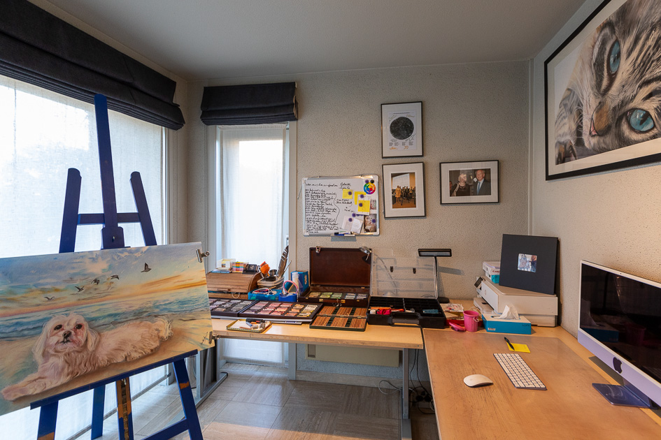 Haar atelier is niet groter dan 6 m2: een tafel in L-vorm met dozen ‘Rembrandt Soft Pastel’ krijt voor de heldere, felle kleuren, Faber-Castell potloden voor de zachtere nuances en een aantal gommen, “that’s it”. En papier, natuurlijk, of behang, want dat maakt van Leen Vereecken meer dan gewoon een goede tekenares.