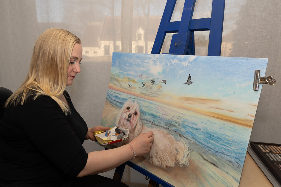 Ze werkt ook veel in opdracht, wellicht door haar groot inlevingsvermogen. “Ik was eens op het strand bezig met het tekenen van een hond, toen er een mevrouw kwam vragen of ik er ook één wilde maken van die van haar. Dat doe ik dan, maar eerst nadat ik begrijp wie en hoe die persoon is. Bij een opdracht gaat het om de verwachting van een ander. De uitdaging dan is die verwachting juist in te schatten zonder dat ik mezelf verloochen. Ik kan vele stijlen aan, maar het moet wel een tekening blijven, met een eigen karakter en met iets van mezelf. Als ze het realistisch willen, dat ze dan een foto maken”.