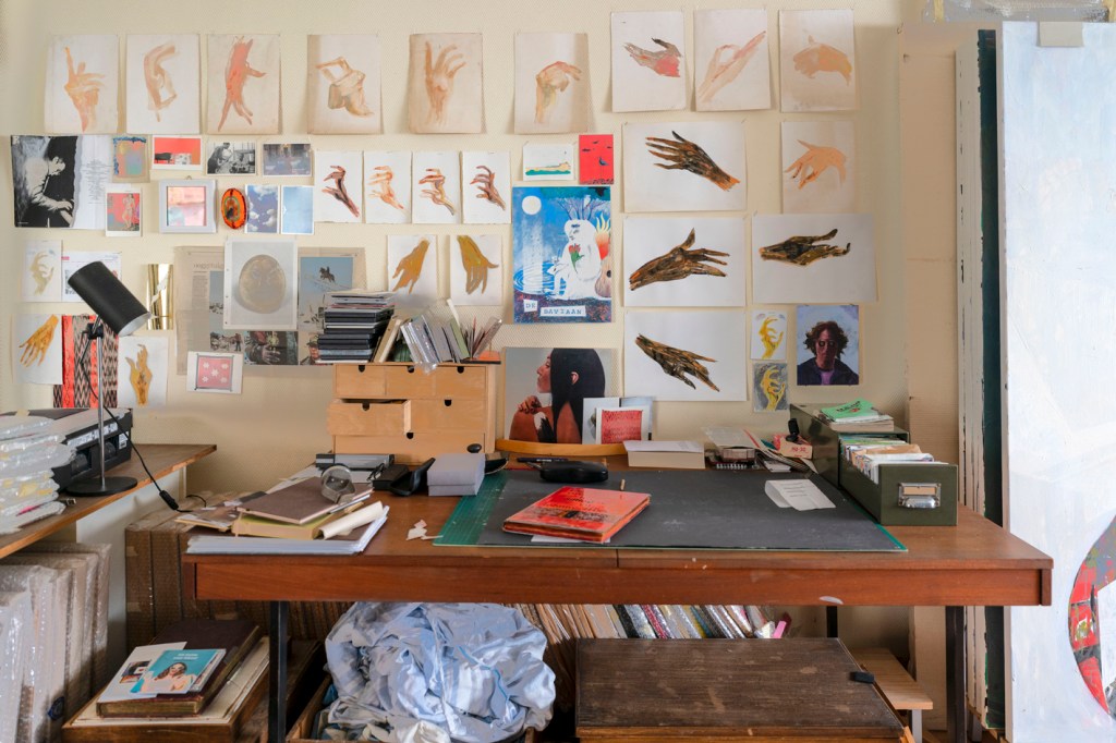 Op, of beter ‘in’ de gitaren zie ik ook handen geschilderd, in heel expressieve vormen, soms als bovenste laag, soms onder een vlak. Hij heeft er een dik schetsboek aan besteed, tientallen bladzijden, alleen maar handen in alle mogelijke houdingen, eerst natuurgetrouw getekend en daarna gestileerd als bloem, blad, boom, dier… Bruikbare resultaten heeft hij boven zijn werktafel gehangen.