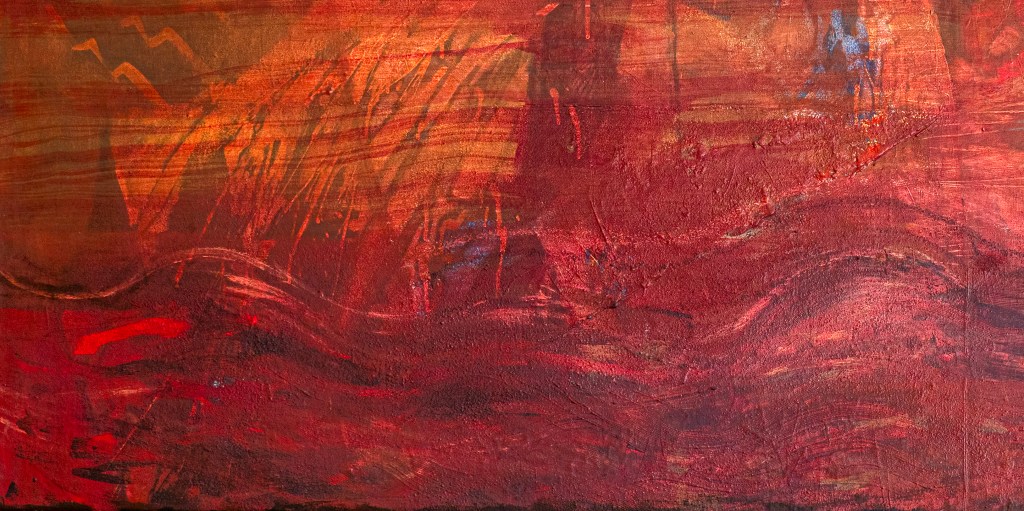 Hoe langer ik ernaar kijk, hoe meer het me meevoert. Ik ga nu dichter staan en zoom in op details, eerst linksonder. Ik zie het plamuursel, een tactiele referentie aan de aarde (een knipoog naar Antoni Tàpies, vermoed ik, een schilder die hij ook bewondert). Ik geniet van het ritme, de complexe gelaagdheid, dat prachtig warm coloriet. Herken ik nu een zeilschip op de golven links? Of laat ik me meedrijven in een droom?