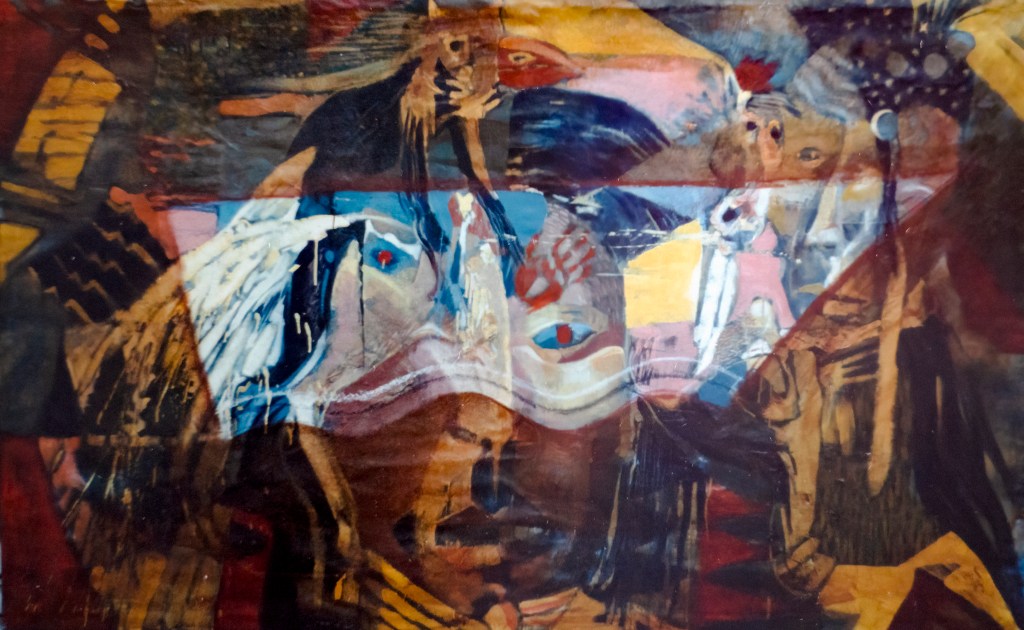 De voorstudie was de basis van een eerste schilderij (nu onderschildering) uit 1986: één en al kleur. De vogel linksboven is opgegaan in het landschap, de gemaskerde ruiter is verenigd tot een vogel (een raaf?), het paard is ook versmolten in het beeld maar kijkt ons nu frontaal aan, terwijl de gevederde indiaan rechts nu in driekwartzicht getoond wordt; de centrale indiaan met de bebloede hand komt uitdrukkelijker in beeld…. Vanop afstand blijf je de diagonale, horizontale en verticale verdeling herkennen, het evenwicht in de chaos.