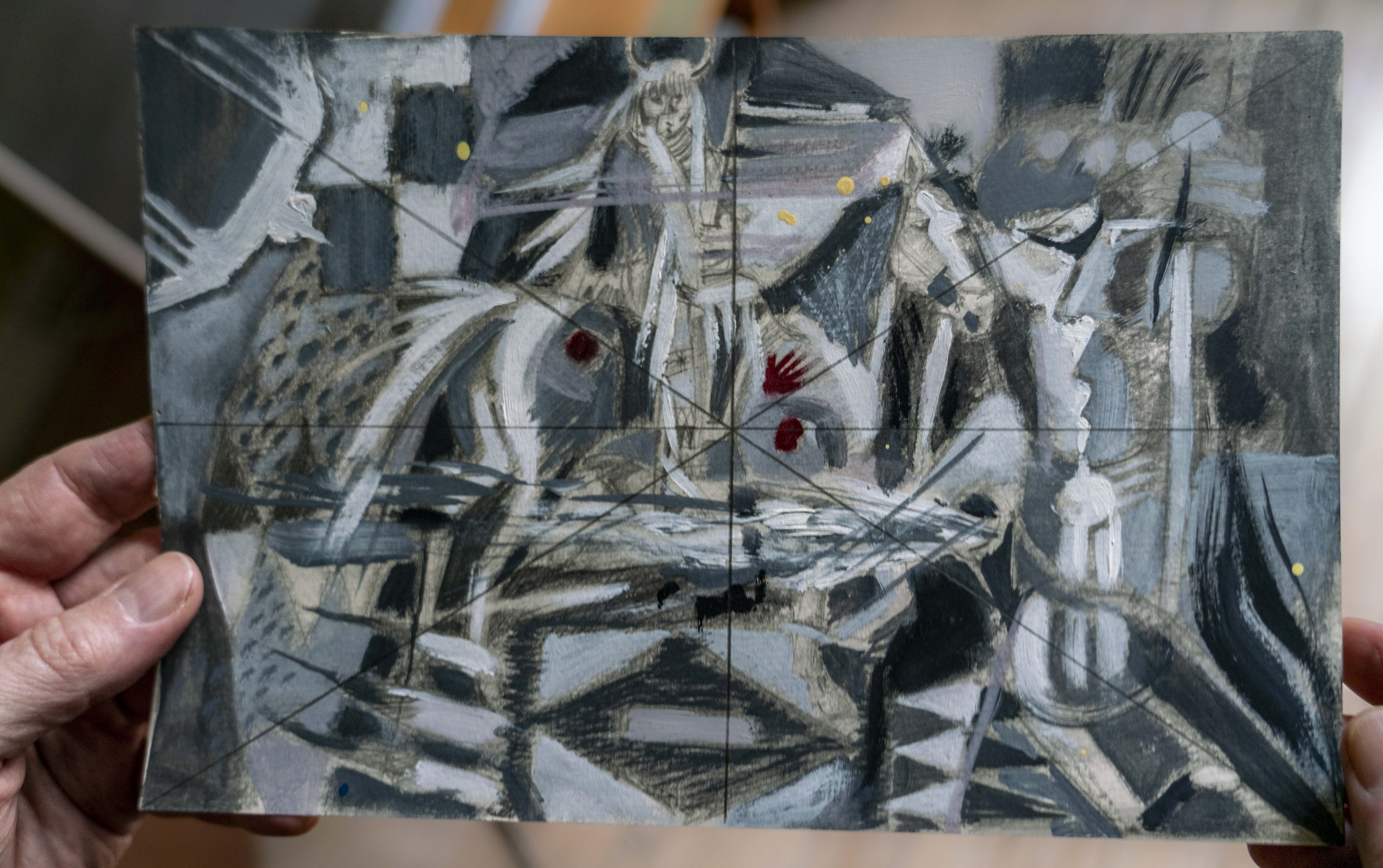 De voorstudie was de basis van een eerste schilderij (nu onderschildering) uit 1986: één en al kleur. De vogel linksboven is opgegaan in het landschap, de gemaskerde ruiter is verenigd tot een vogel (een raaf?), het paard is ook versmolten in het beeld maar kijkt ons nu frontaal aan, terwijl de gevederde indiaan rechts nu in driekwartzicht getoond wordt; de centrale indiaan met de bebloede hand komt uitdrukkelijker in beeld…. Vanop afstand blijf je de diagonale, horizontale en verticale verdeling herkennen, het evenwicht in de chaos.