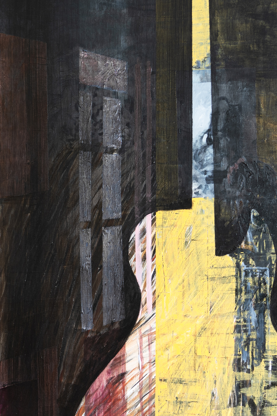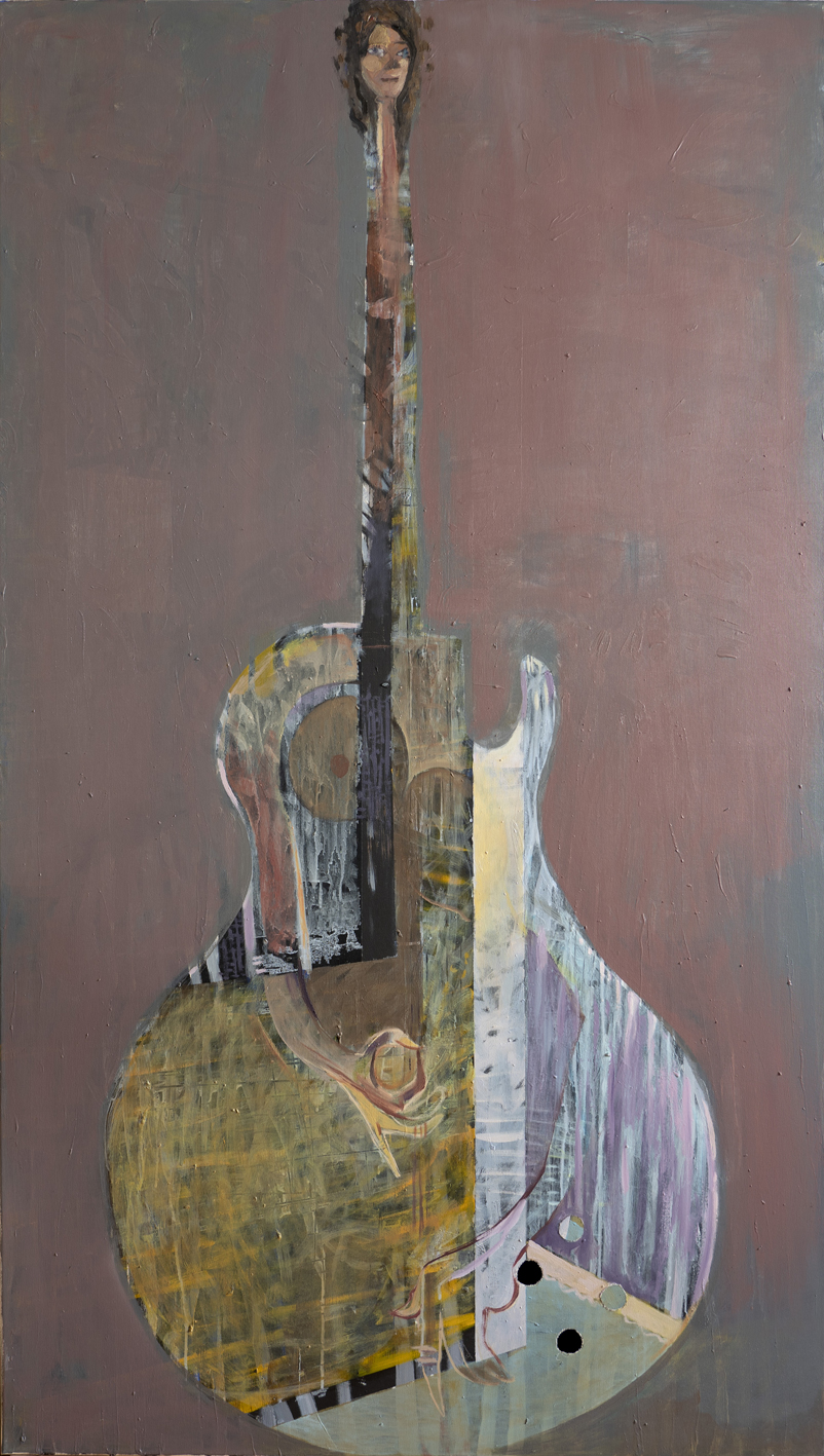 Ten slotte schildert hij alles wat zich rond de vorm van de gitaren bevindt weg, in een tint van wit, grijs of donker. Op sommige doeken brengt dat rust, op andere schemeren beelden door, een decor van ervaringen, met elkaar verweven maar vervaagd. Enkel de gitaren zijn niet gedempt, niet overschilderd, zij geven hun “feedback”, ongefilterd. Zoals ‘Old Black’ met Neil Young communiceerde via de versterker, communiceert elk doek nu met de schilder via de gitaar. In beide gevallen is de toeschouwer een getuige die zich kan laten meevoeren door de ziel van het werk.