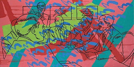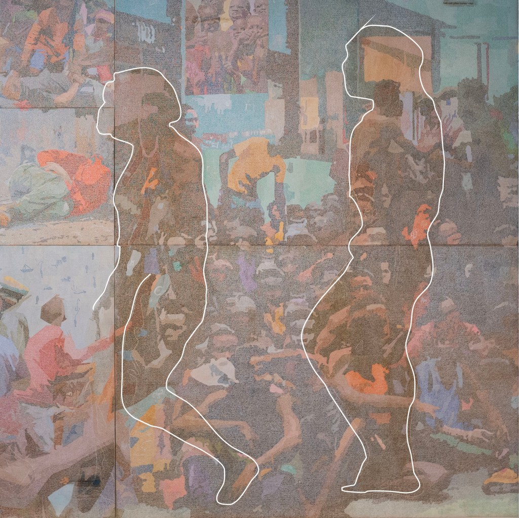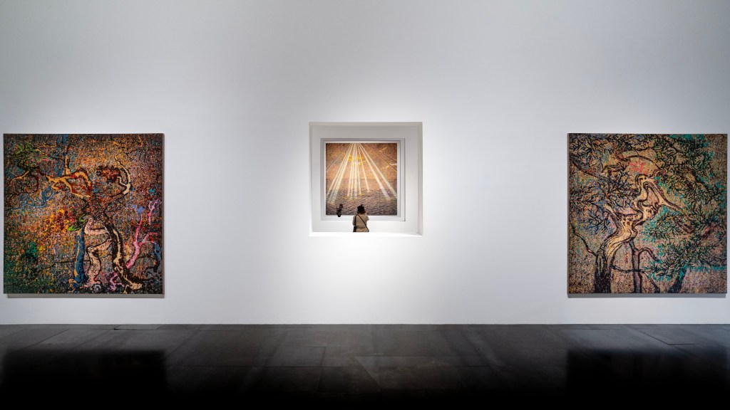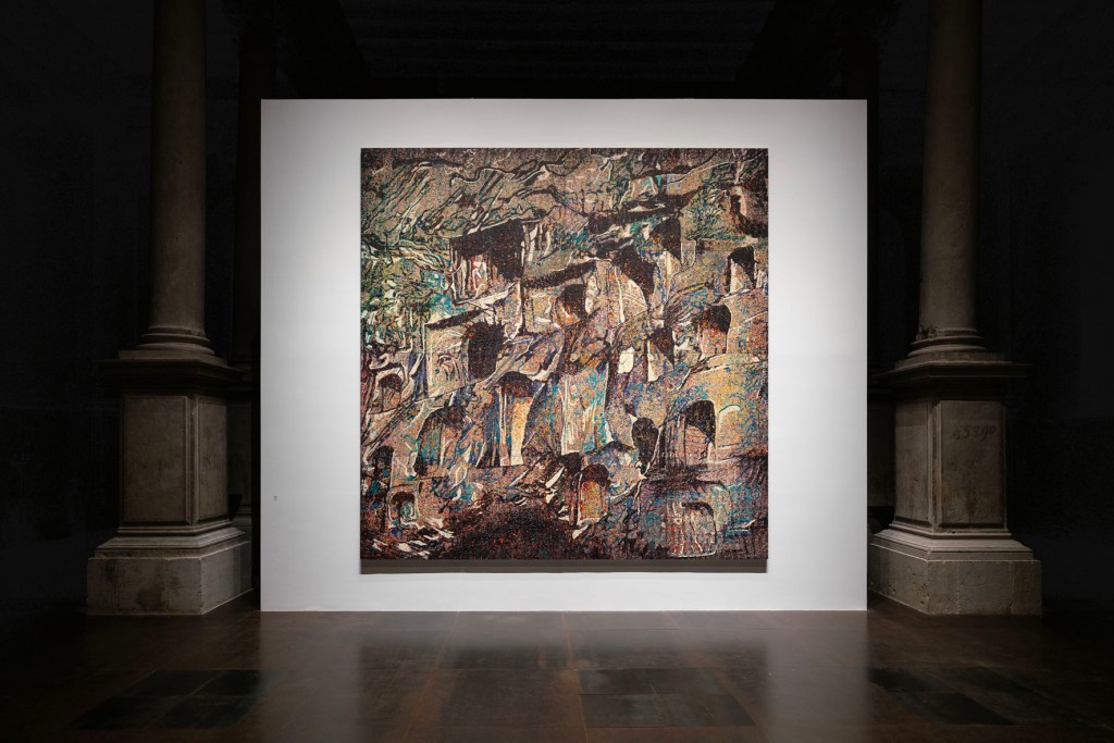 Links, Zeng Fanzhi, ‘Non-Self’, olie op canvas, 2019-2023, 16 panelen, 480 x 480 cm