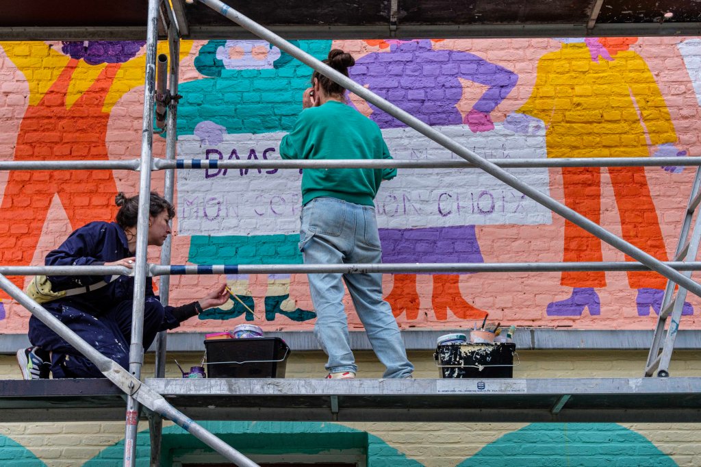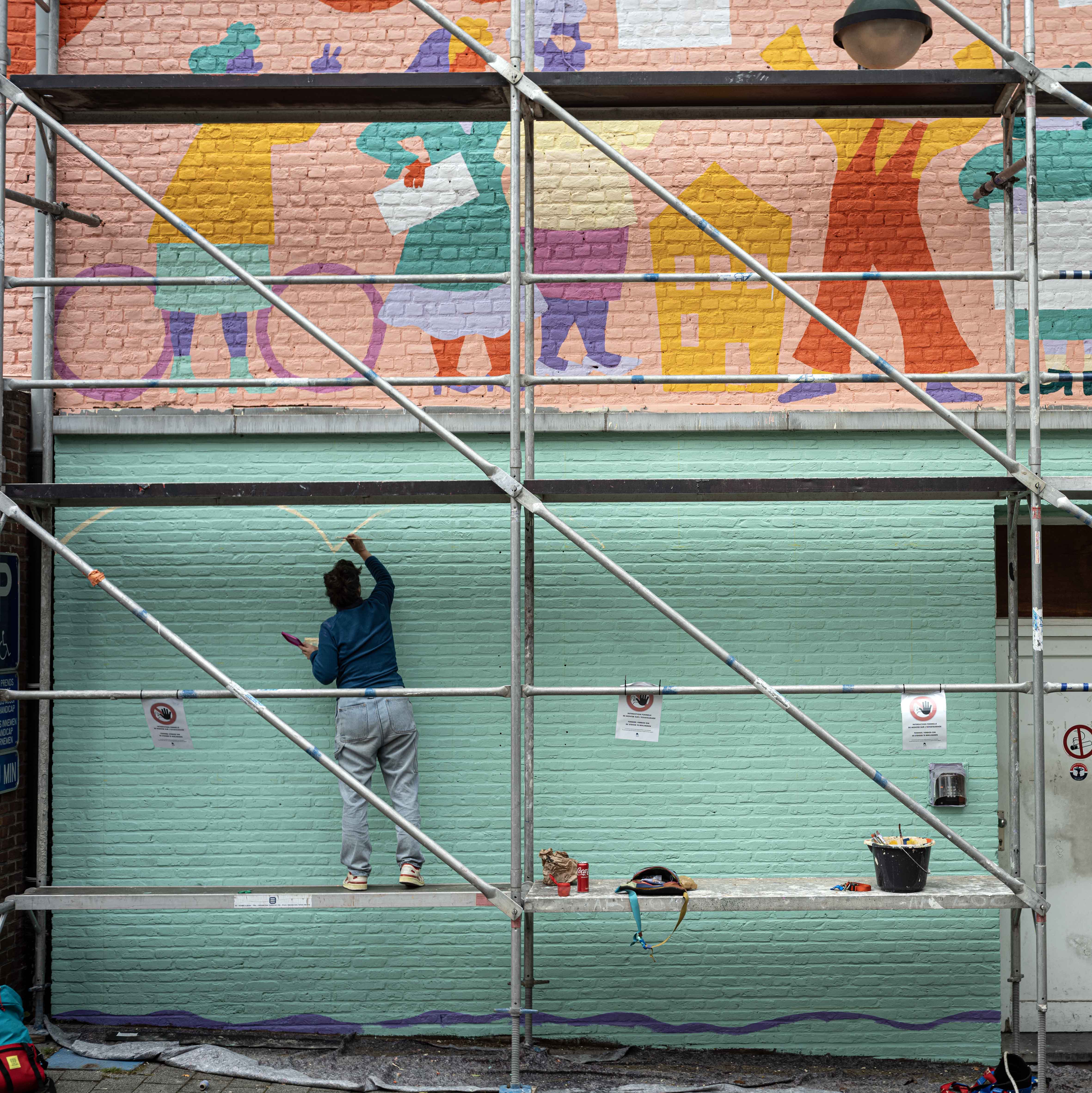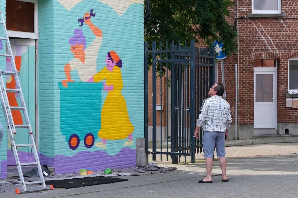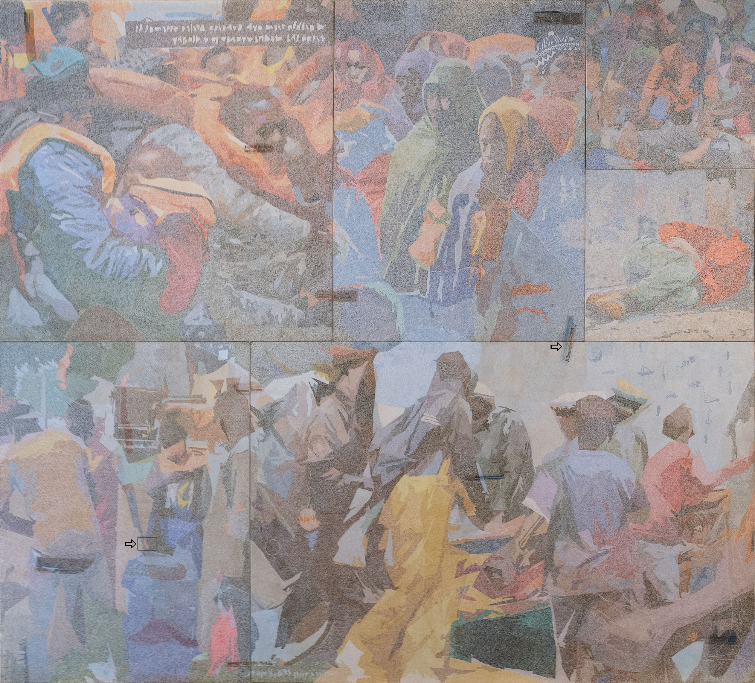 Naarmate ik dichter bij het werk ‘Non-Self’ kwam, leek het op grotwoningen, nissen, impressionistisch geschilderd, kleurrijk maar toch gedempt. Maar toen ik er met mijn neus voor stond, ging er een nieuwe wereld voor me open: pointillistisch, maar impasto, nat-in-nat, met ontelbaar verschillende heldere pigmenten, extreem gecontroleerd geschilderd, geen spat te veel, op sommige plaatsen is het canvas nog te zien, een levende cursus kleurentheorie, een ode aan de materialiteit van de olieverf, de pure abstractie van in elkaar overvloeiende helle pigmenten die vanop afstand een figuratief beeld vormen dat heerlijk zacht is, mystiek en vol diepte. Ik vond en vind het indrukwekkend, telkens ik ernaar kijk.