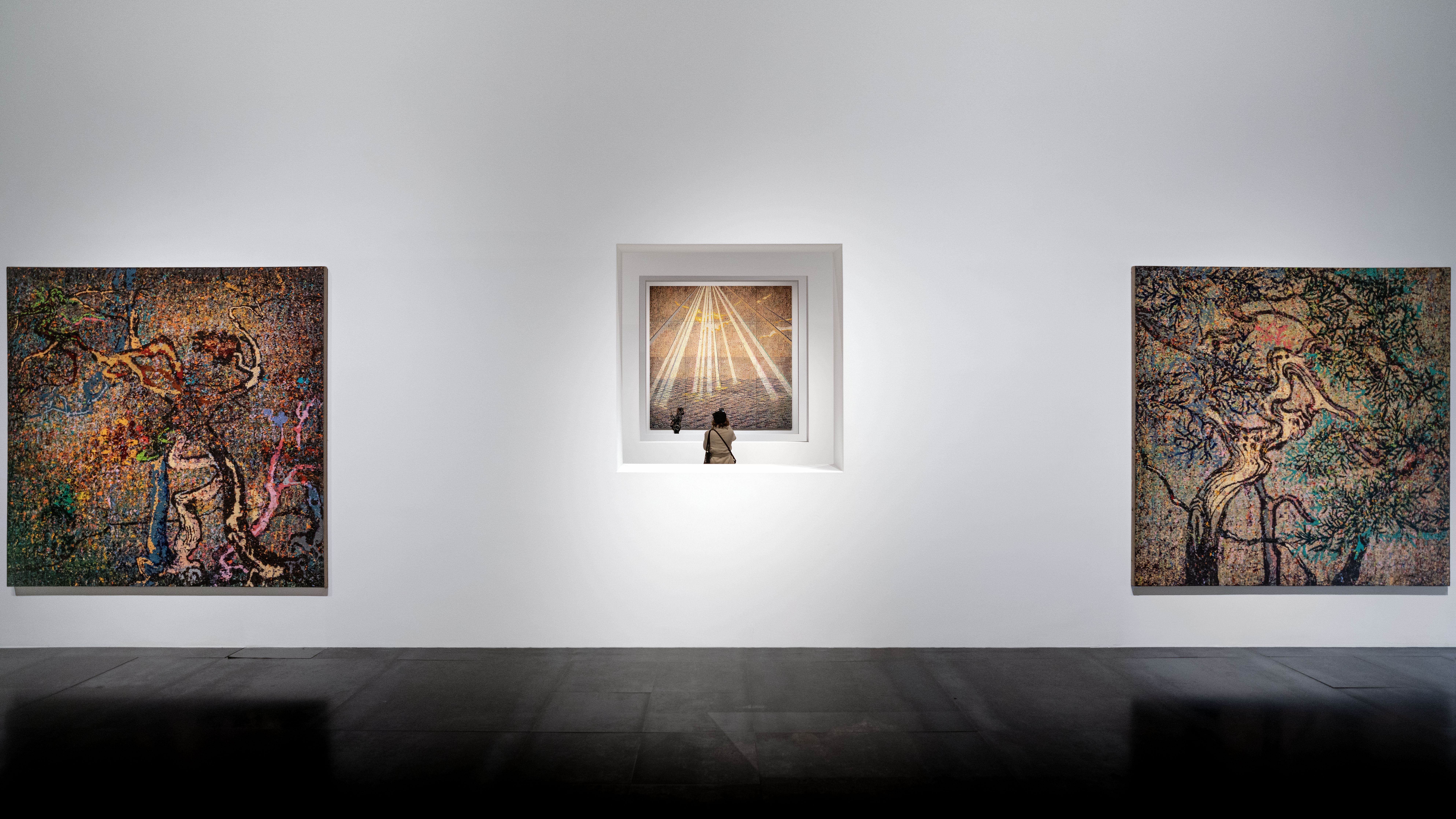 En dan, als je denkt het einde te hebben bereikt, onder de indruk van de grootsheid en de symboliek van dat werk, die kleurenpracht, die architectuur, kom je in een kleinere, langwerpige, sobere ruimte met niets dan monochrome inktlandschappen. Ze zijn ragfijn geschilderd op de natuurlijke patronen van handgeschept papier. Ook hier combineert Zeng