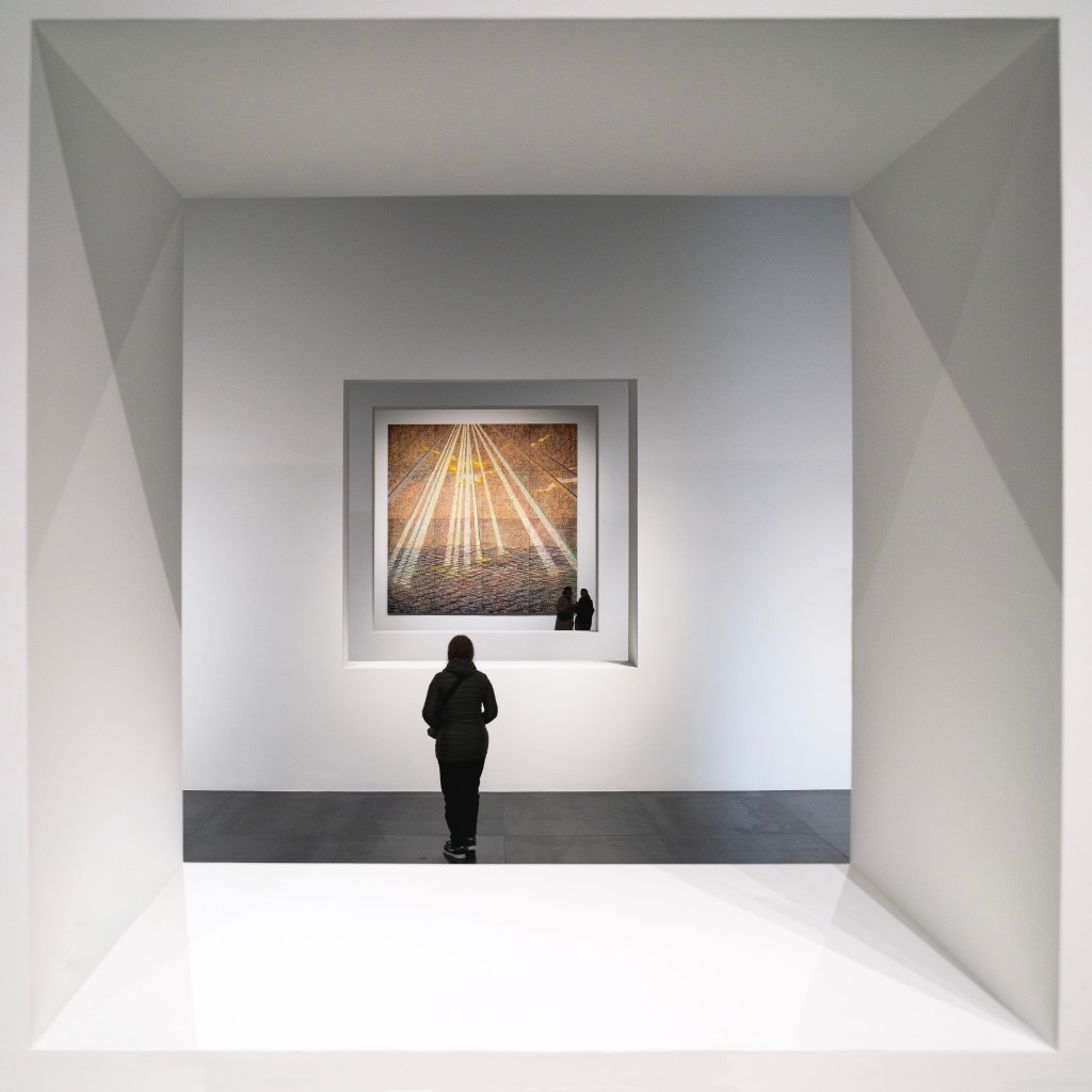 Tadao Ando is een minimalist die zich kon uitleven in dit enorme gebouw. Het gelijkvloers wordt beheerst door een magistrale zuilengalerij, voor de rest is er niets dan lege ruimte, 46 m lang, 19 m breed en 10 m hoog en, zoals het een minimalist betaamt, deed Ando er ook niets mee, hij liet de ruimte voor wat ze is, hij verduisterde zelfs de meeste ramen, zodat je als bezoeker verdwijnt in het halfduister en je je aandacht enkel kunt richten op een helverlicht, gigantisch schilderij in de verte vóór je. Eens je bekomen bent van het zicht en je je in een natuurlijke reflex omdraait, zie je een tweede werk van dezelfde omvang aan het andere uiteinde. Twee verlichte schilderijen, elk 4,8 bij 4,8 meter, bestaand uit 16 panelen en verder niets, buiten statige zuilen, in die schemering van 874 m2. Ik kan je verzekeren: het raakt je.