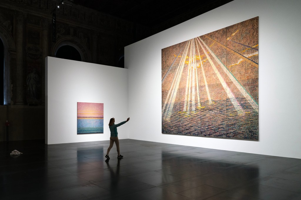 Zeng Fanzhi (1964) is een van de meest succesvolle kunstenaars van China, zeg maar van heel Azië. Tijdens de Biënnale kan je recent werk van hem bewonderen in een zogenaamde ‘collateral’ expo. Dat zijn tentoonstellingen, 30 in totaal, die los van de officiële selectie, ergens in de stad, in een historisch gebouw, een verlaten kerk of een museum plaats vinden. Voor de expo van Zeng Fanzhi vormde het budget blijkbaar geen probleem. Dankzij het Los Angeles County Museum of Art (LACMA) kreeg hij een megatentoonstelling in de historische Scuola Grande della Misericordia, een prachtig zestiende-eeuws gebouw. De inrichting werd overgelaten aan Tadao Ando (1941), een wereldberoemd Japans architect. Het resultaat van hun samenwerking is grandioos, onvergetelijk voor een onbevangen bezoeker zoals ik, die voordien nog nooit van de schilder of de architect had gehoord. Ik ga naar de Biënnale om te ontdekken, niet om bevestiging te zien.
