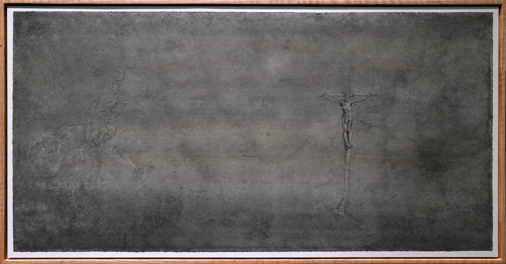 Fanzhi christelijke, boeddhistische en literaire iconografie, maar nu intimistisch. Een Christus aan het kruis is als natuurlijk verbonden met rotsen en oude bomen, traditionele Chinese symbolen van kracht, veerkracht en een lang leven. Adam en Eva krijgen de appel van een slang uit een eindeloze boom die in de structuur van het papier tot aan de hemel reikt. Het lijkt wel geëtst, of is het potlood- of krijtgetekend, geschilderd? Ik weet niet hoe hij het doet, maar het is van een onbeschrijfelijke finesse.