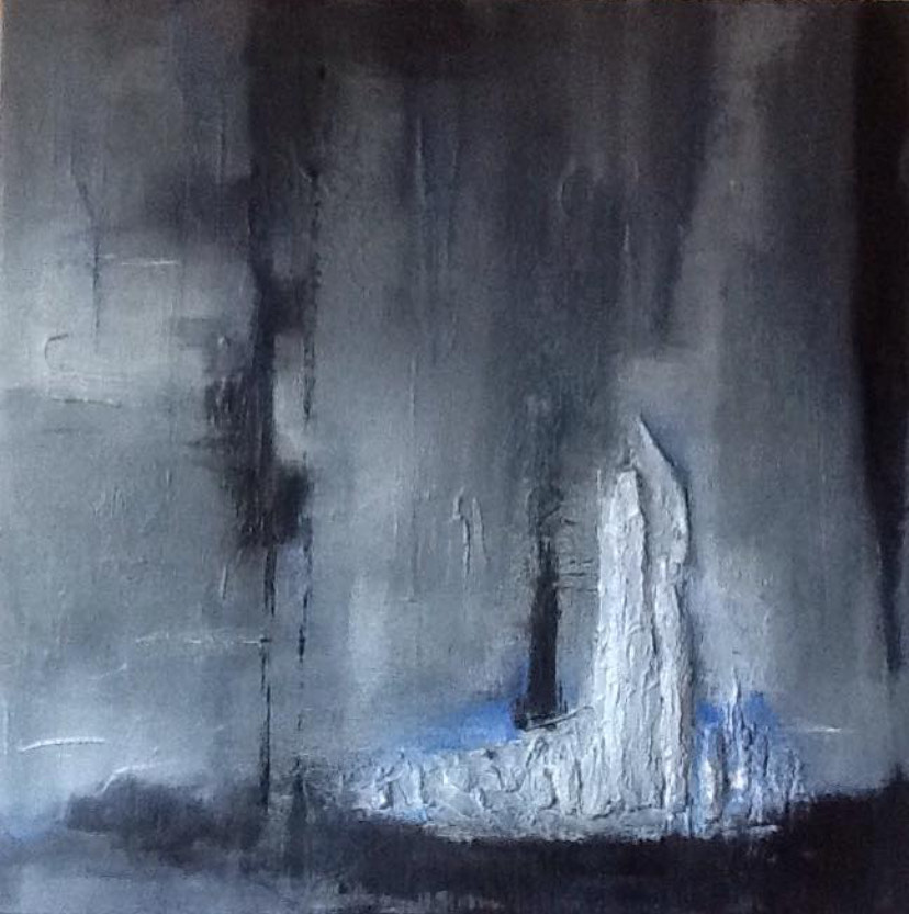 ‘Heb ik geschilderd na een stukgelopen relatie. Ik werk steeds heel intuïtief. Ik had de dag dat ik aan het schilderij begon boomschors meegebracht uit het bos. Ik verwerkte dat in het schilderij en zo ontstond heel intuïtief een ‘eilandje’ waarop een koppeltje (de boomschors) stond. Ik zag daarin de herinnering aan een oudejaarsnacht op een ‘eilandje’ in de Seine in Parijs. De gelukkigste oudejaarsnacht van heel mijn leven tot nu toe. En toch ervaarde ik een gevoel van verslagenheid…. opnieuw een relatie die stukliep….’