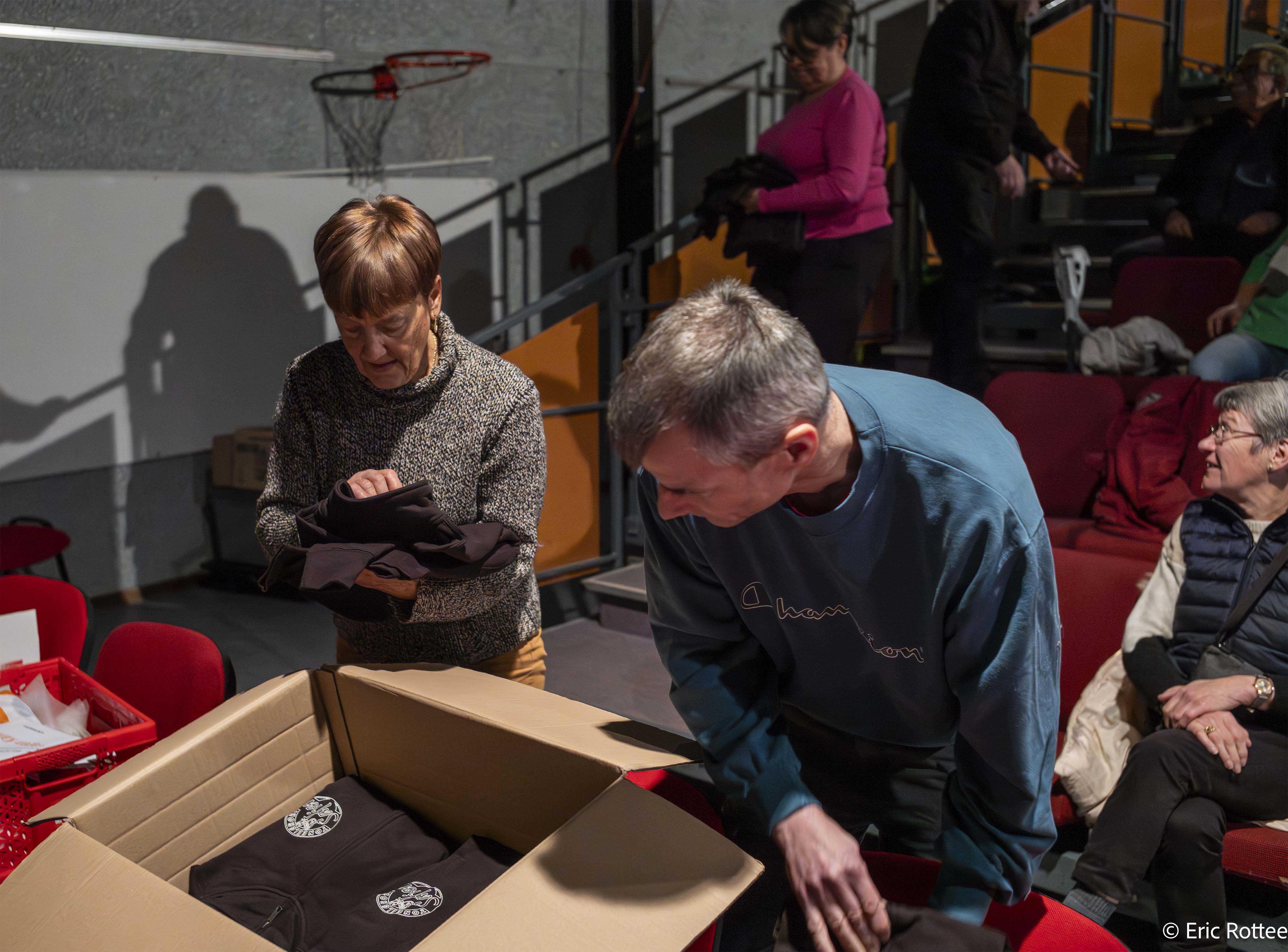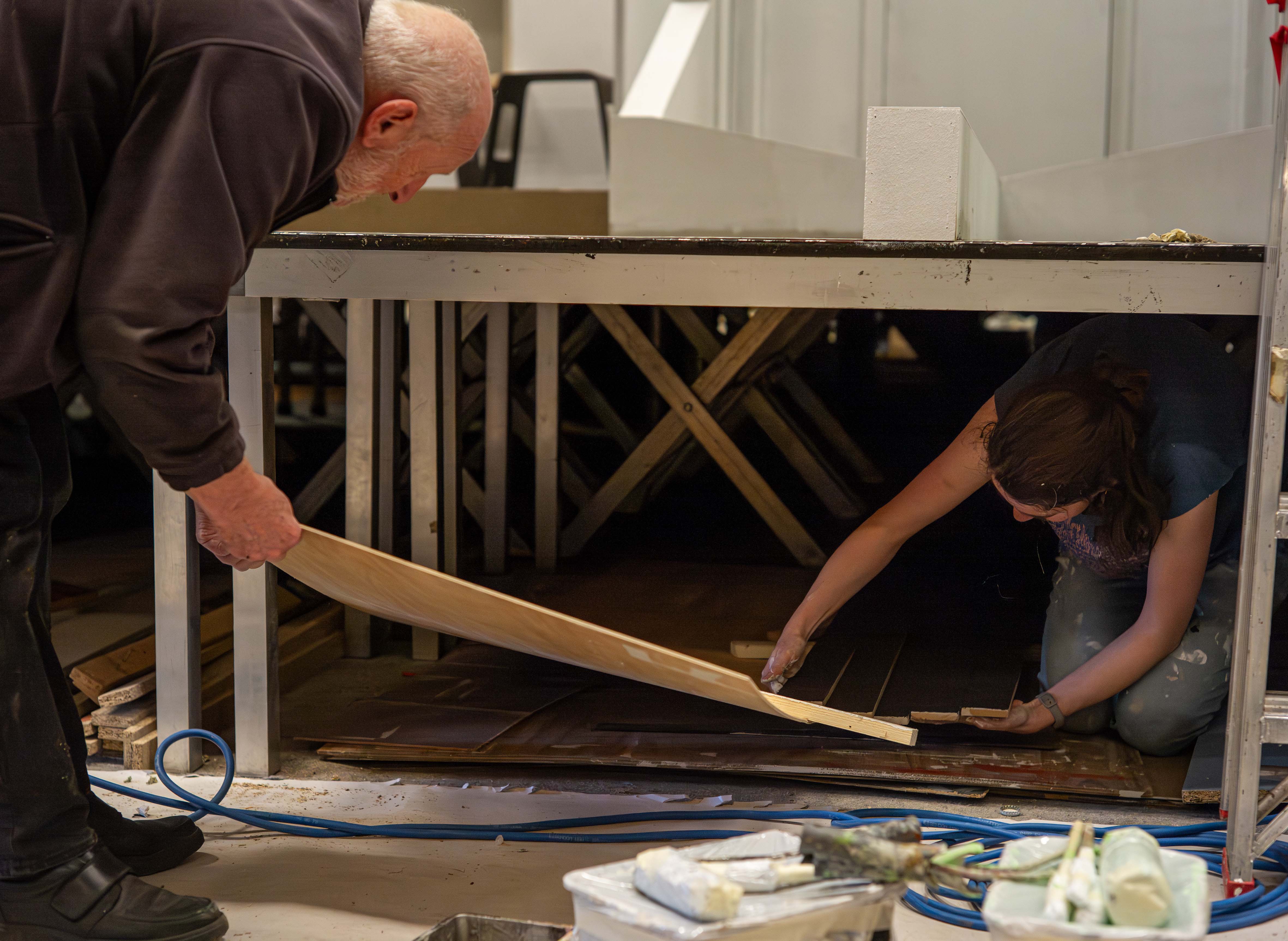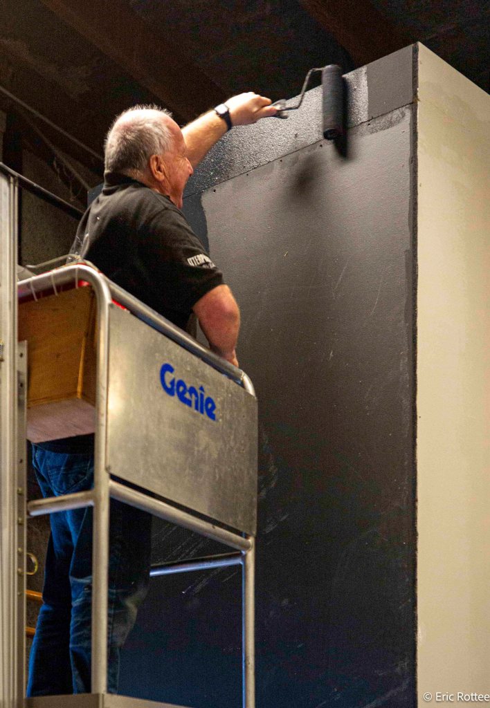 Zelfs de sleutel op de deur van de bergruimte werkt! “Zo moet het zijn” zegt Piet-Paul, de architect van het decor. Hij heeft tekeningen van elk stuk apart gemaakt. In deze multifunctionele zaal staat normaal gesproken geen podium. Dus geen keuze, er wordt een podium gebouwd volgens de geldende eisen voor veiligheid. Zwart moet zwart zijn: aan beide kanten sluiten hoge zwarte planken het decor af. Het was in de jaren negentig dat de Harvard Business Review aantoonde dat vrijwillige organisaties efficiënter zijn dan ondernemingen of publieke instellingen. De redenen zijn zin en motivatie. Er zijn minstens tien mensen betrokken bij de decorbouw, tijdens het weekend, op 11 november – een vrije dag en ’s avonds, noodzakelijk vanwege de vertraging. Knutselen, verven… sommigen hebben een speciale taak, zoals Jan voor de techniek.