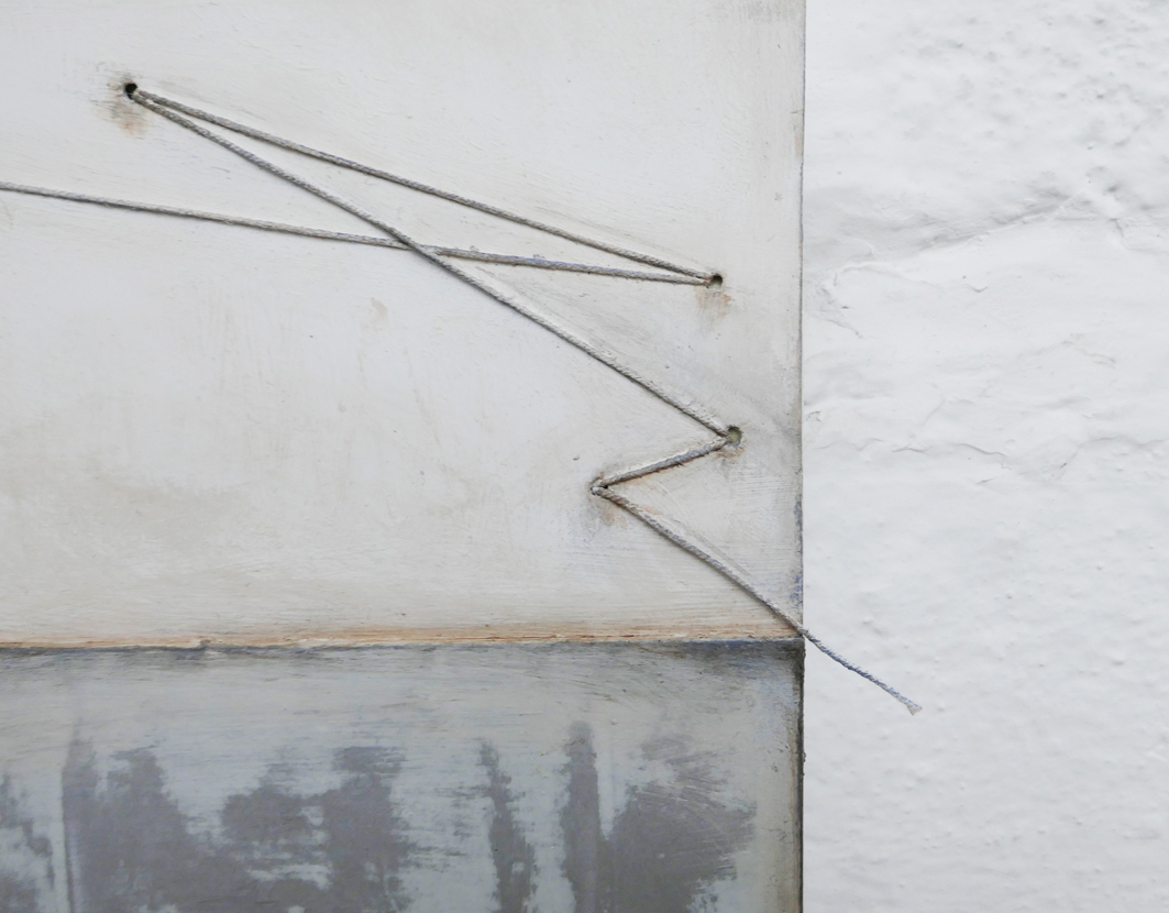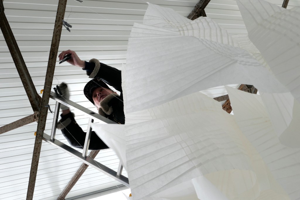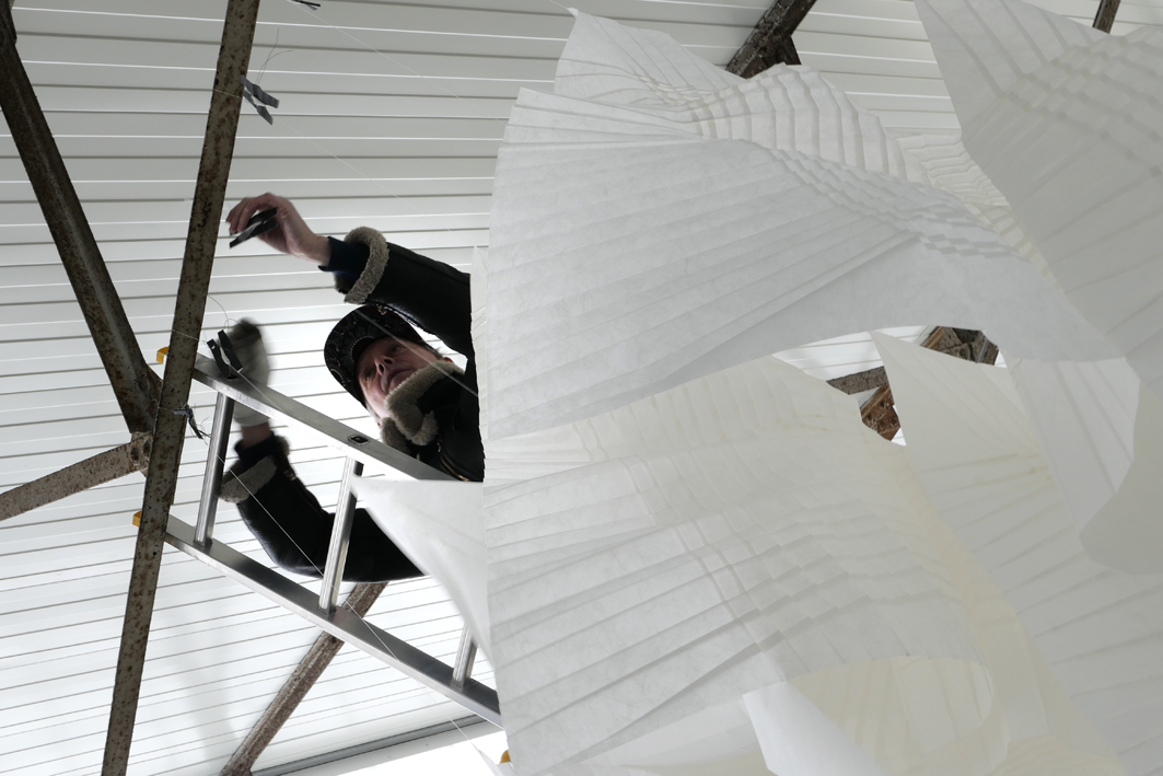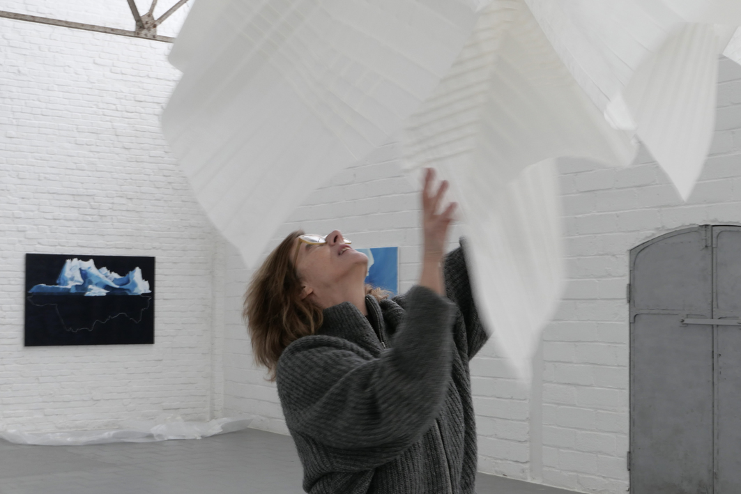 De materie die de kunstenares gebruikt blijkt papier te zijn, papier in model gebracht door middel van geplooide randen. Wonderlijk dat je door bepaalde vouwtechnieken een blanco vel papier kunt omtoveren tot dergelijk fragiel sculptuur. Mieke werkt heel intuïtief en laat toeval een rol spelen. Ze houdt ervan werk in situ te maken zoals hier in deWeverij. Spelen met de ruimte maakt het voor haar extra boeiend. Hoe uniek is het beeld van de aan een zijden draadje zwevende sculpturen, bewegend op het ritme van schuivende ijsschotsen!