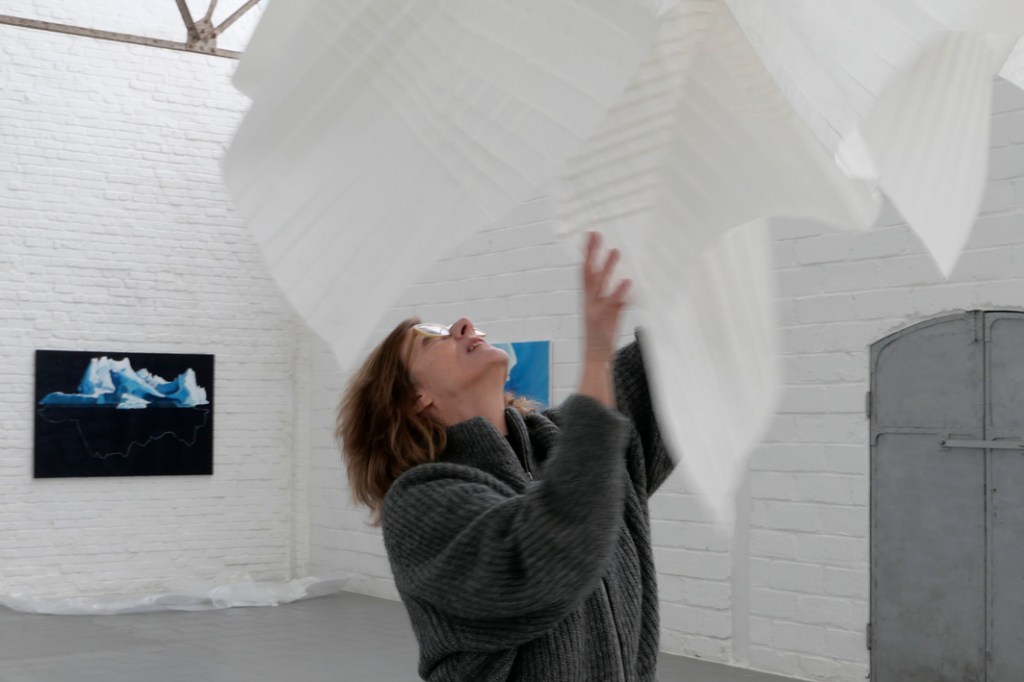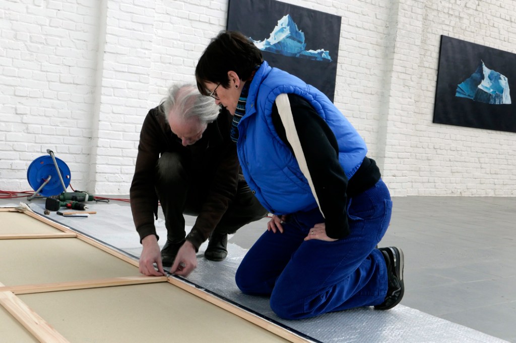 Om 14u sta ik aan de deur van deWeverij. De opbouw is volop bezig, de toon is gezet en het resultaat laat zich raden. De sfeer van het hoge Noorden vult de daglicht vangende ruimte. Met een beetje verbeelding streelt een vleugje arctische lucht mijn wangen en sta ik langs de waterkant de magische fascinerende ijsschotsen gade te slaan. Het timmeren, nagels kloppen, draadjes spannen… kan even wachten. De kunstenaars maken graag wat tijd om met mij in dialoog te gaan.
