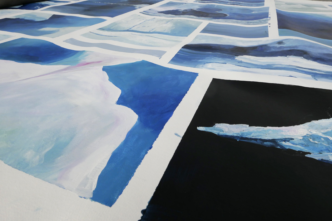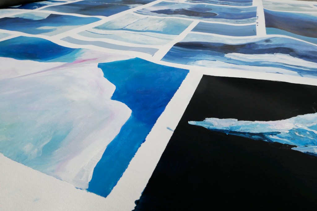 Ik sta voor een immens canvas van Brigitte De Vuyst, bijna 4m breed. Het is een monumentaal schilderij, niet alleen het formaat maar ook het onderwerp, een drijvende ijsschots, imponeert. Het gebruik van een paletmes, de afwisselend driftige en gladde penseelstreken, de sporen van het vegen met de vingers, de donkerblauwe achtergrond en zachte ook harde blauwen verraden de passie waarmee dit doek het daglicht zag.