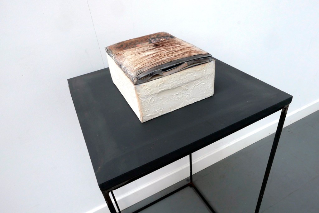 Een witboek verzamelt data, analyseert een probleem en zet lijnen uit voor acties aan de hand van objectieve data. Het Witboek ‘Smeltende stiltes’ van Marc Mestdagh verwijst naar de nefaste impact van de mens op de natuur. Het is een repliek op het werk van Brigitte en Mieke, een antwoord op hun lofzang over de ijsformaties van IJsland, schitterend in al hun pracht. Zijn ‘bijbel’ is gesloten, symbolisch voor de onmacht, het niet weten waarheen we gaan, welke acties te ondernemen.