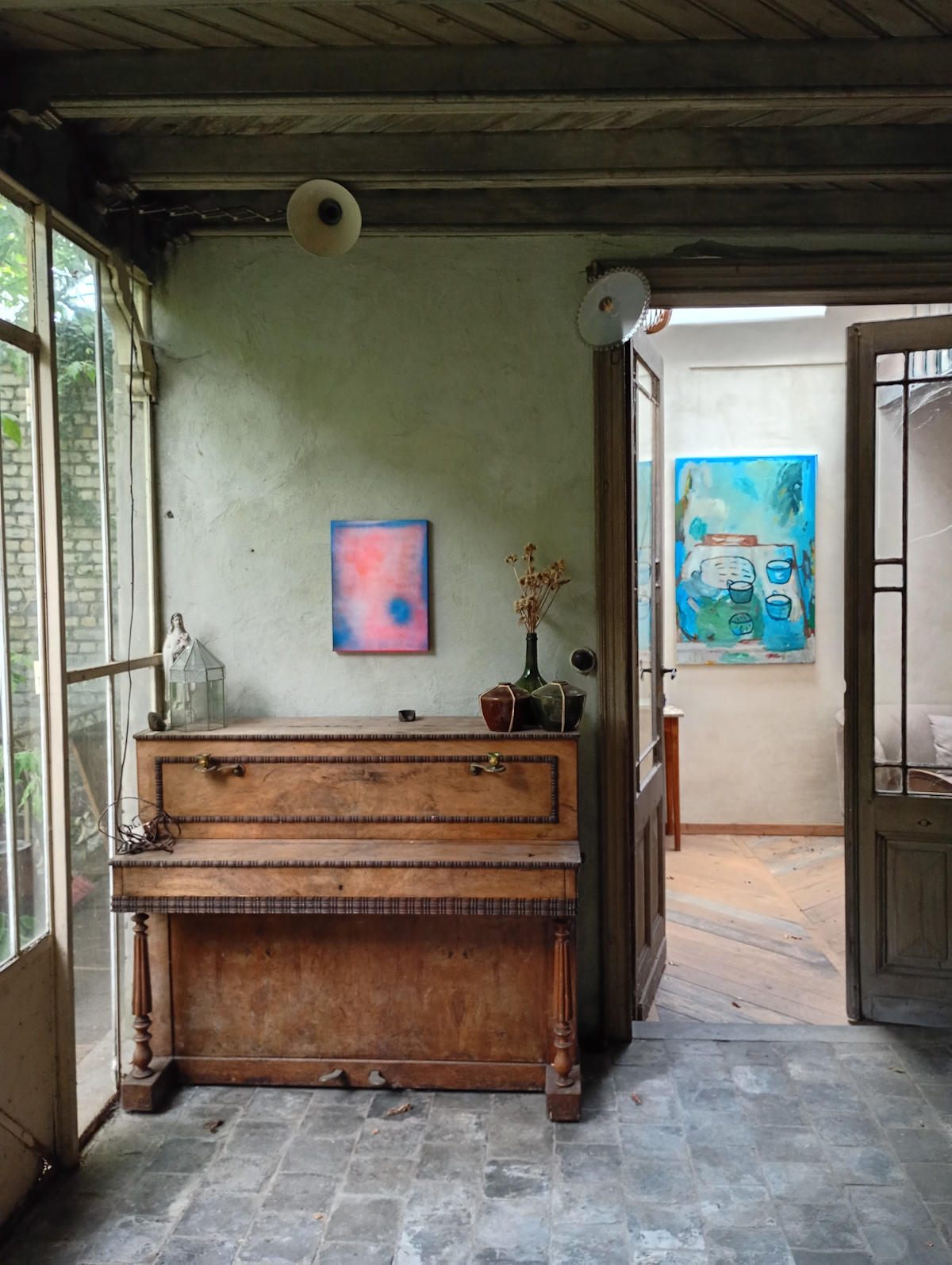 Wim Baes We starten met groepstentoonstellingen. Voor individuele expo’s is de ruimte te groot. Beneden alleen al beschik ik over een 30 tal lopende meter muur, boven zijn er ook nog twee mooie grote ruimtes. De galerie kan ik zelfs uitbreiden naar nog meer toonmogelijkheid. In de zomer kan ik ook de orangerie erbij betrekken. Zowel beneden als bovenverdiepingen beschikken over een eigen specifieke sfeer, vragen een bepaald werk wat formaat, inhoud of gevoel betreft, ideaal voor groep expo’s. Perfect voor mij als een galeriehouder die graag samenstelt en begeesterd op zoek gaat naar combinaties om uiteindelijk een sterke verrassende expo in het leven te roepen.
