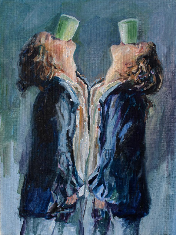 Hervé Martijn De reden is heel eenvoudig, ik werk in reeksen. Ik maakte een reeks van mijn kleinkinderen de tweelingen, de meisjes maar mijn kleinzoon wilde ook een schilderij. Ik fotografeerde hem met de kroon van zijn verjaardag met als gevolg een reeks van vier of vijf schilderijen met de kroon. Ooit schilderde ik een zelfportret met viewmaster, dat is niet een viewmaster maar DE viewmaster van mijn groottante met beelden van Lourdes, Lourdes die ze één maal in haar leven bezocht. Als kind heb ik duizend keren naar die viewmaster beelden zitten kijken. Mijn 80jarige tante vertelde telkens opnieuw en opnieuw van die ene reis naar Lourdes. Die viewmaster is een beladen voorwerp, met een enorme betekenis, gevoelsmatig zeer belangrijk. Nu kijken mijn kleinkinderen in de viewmaster van mijn moeder en vertel ik hen het verhaal van de viewmaster van hun overgrootmoeder. Ik kijk achterop naar het verleden, de melancholie is nooit ver weg, nestelt zich en voelt zich geborgen in mijn schilderijen, klaar om met de kunstliefhebber in dialoog te gaan.
