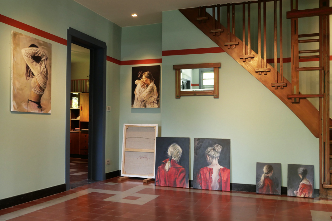 Hervé Martijn Ik zoek geen onderwerpen, ik kom ze tegen op mijn pad. Ik neem massa’s foto’s, van mensen die ik ken, van familie, daarna volgt de aanzet… soms zeg ik halt omdat het schilderij niet goed aanvoelt. Ik heb één model waarmee ik goed kan samenwerken, het klik goed. Ze komt uit de wereld van het toneel, is creatief en brengt me op ideeën, ideeën waar ik moet aan wennen en die achteraf wonderlijk goed blijken te zijn. Het toevallige laat ik graag meespelen zoals die keer toen ze hier arriveerde met een valies vol kleren, onder ander met een rood bloemrijk vestje, niet onmiddellijk een accessoire waar ik aan dacht en … het bleek inspirerend voor een nieuw schilderij.