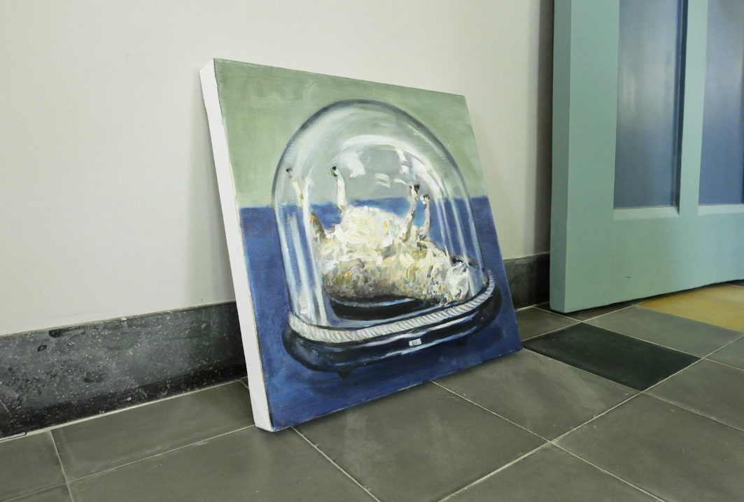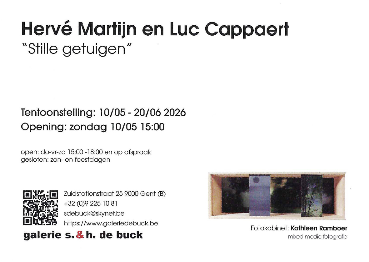 Hervé Martijn ontvangt me hartelijk. De uitnodigende grijsgroenblauwe traphal baadt in een poëtische, melancholische, nostalgische zelfs magische sfeer. Ik kan me geen betere plaats bedenken voor het creëren van canvassen waarin familie, herinneringen en emotie een rol spelen. Bij een wandeling doorheen het huis voel ik me als een ontdekkingsreiziger en val van de ene verrassing in de andere. De vele kamers geven hun geheimen niet prijs maar tonen wel een schat aan schilderijen. In een zelfportret, het enige dat ik er zag, kijkt hij door een viewmaster verwonderd naar de wereld, de beschouwer in het bijzonder, de kunstenaar observeert om later vast te leggen wat hij voelt, ervaart en ziet. Zeggen beelden niet meer dan woorden? De ‘beelden’ die ik vandaag opvang neem ik mee mijn hele leven lang, ze doen me stilstaan, nadenken en mijmeren. Ik maak een reis doorheen de volledige carrière van de kunstenaar en ontdek werken waar ik niet eens een vermoeden van had, geschilderd in diverse technieken met vele materialen. Acrylverf, olieverf, bijenwas, dripping, gebruik maken van oxidatie, schilderen op vintage valiezen, op een oude kaft, op ongewone ondergronden… hij probeerde het allemaal. De kunstenaar staat werkelijk open voor artistieke vernieuwing en evolutie. Zijn samenwerking met de conceptuele geluidskunstenaar Baudouin Oosterlynck is daar niet vreemd aan. Tegenwoordig toont hij zijn jarenlange vakmanschap in figuratieve schilderijen in olieverf.