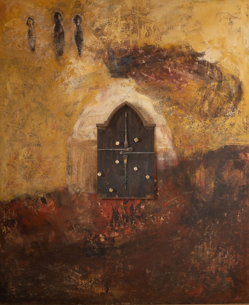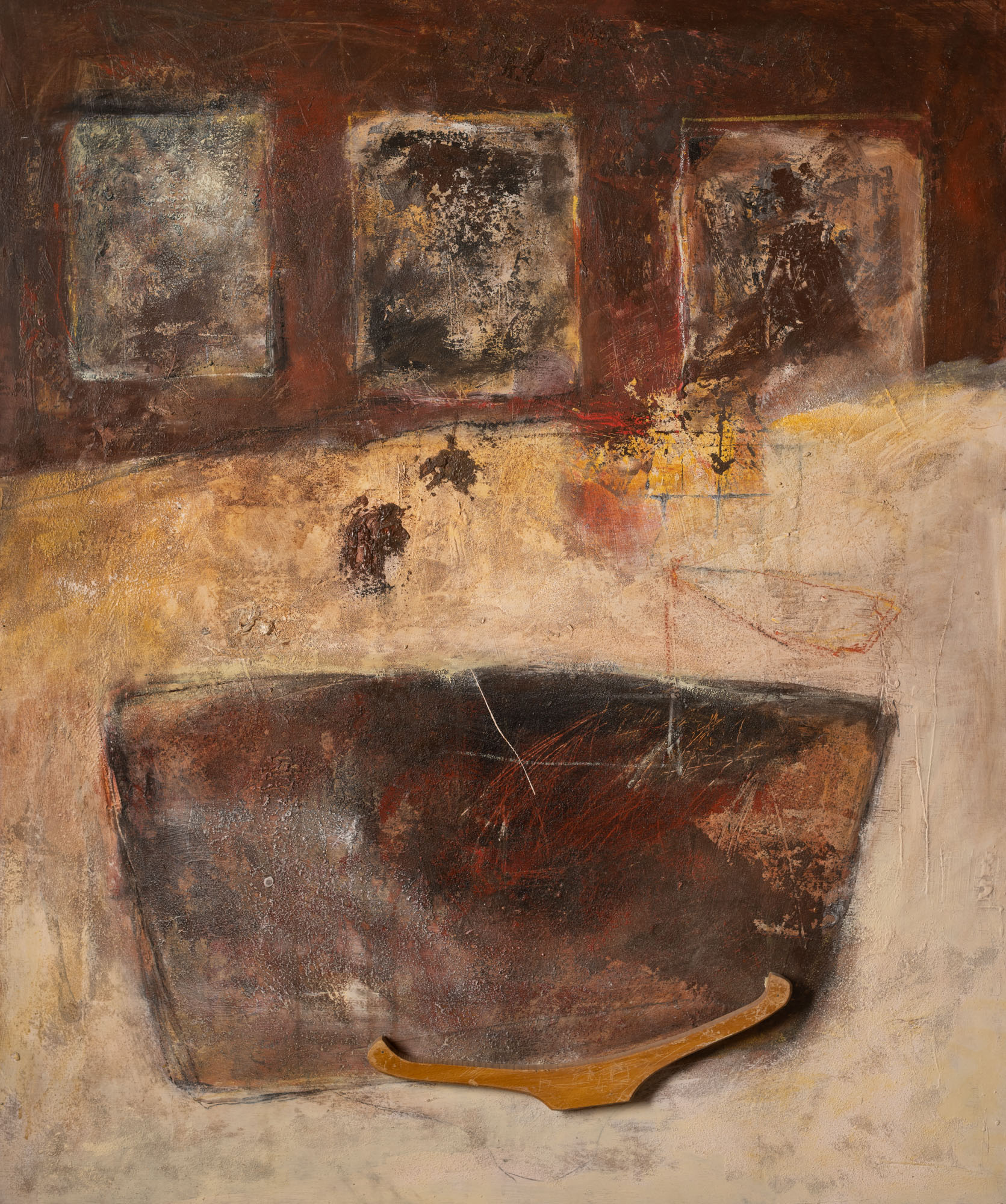 Johan Clarysse Mijn nieuwe levenssituatie bracht de drang tot het maken van een inventaris met zich mee. Van 1988 tot nu kom ik zo tot een kleine duizend werken: schilderijen, tekeningen, collages. Deze twee reeksen die ongeveer 30 jaar in mijn atelier gestockeerd stonden, liggen me na aan het hart. Deze werken hebben mij als kunstenaar op de kaart gezet. Ze maken deel uit van mijn schilderkundige identiteit, ik ben die werken nog altijd. Ze dragen de kiem in zich van wat later volgde. In deze reeksen zie je het figuratieve element in mijn oeuvre binnen sluipen. De canvassen bevinden zich op de grens van pure abstractie naar figuratie. Geabstraheerde archetypische symbolen zoals ramen, een huis, boot, zeppelin, een zwaard… komen tevoorschijn, maar vooral vormelijk zie ik deze reeksen als de basis voor later werk. Je voelt het spel met beeldende spanningsvelden, hét kenmerk van goede kunstwerken volgens mij. Dit kan zijn een licht donker contrast, figuratie versus abstractie, , lineaire of grafische accenten tegenover organische, picturale tegenover sculpturale elementen enz… Die periode zocht ik ook naar een mogelijkheid om 3-dimensionaal te werken. Verf mengde ik met zand, cement, mortel en ik begon objecten in mijn schilderijen te integreren.