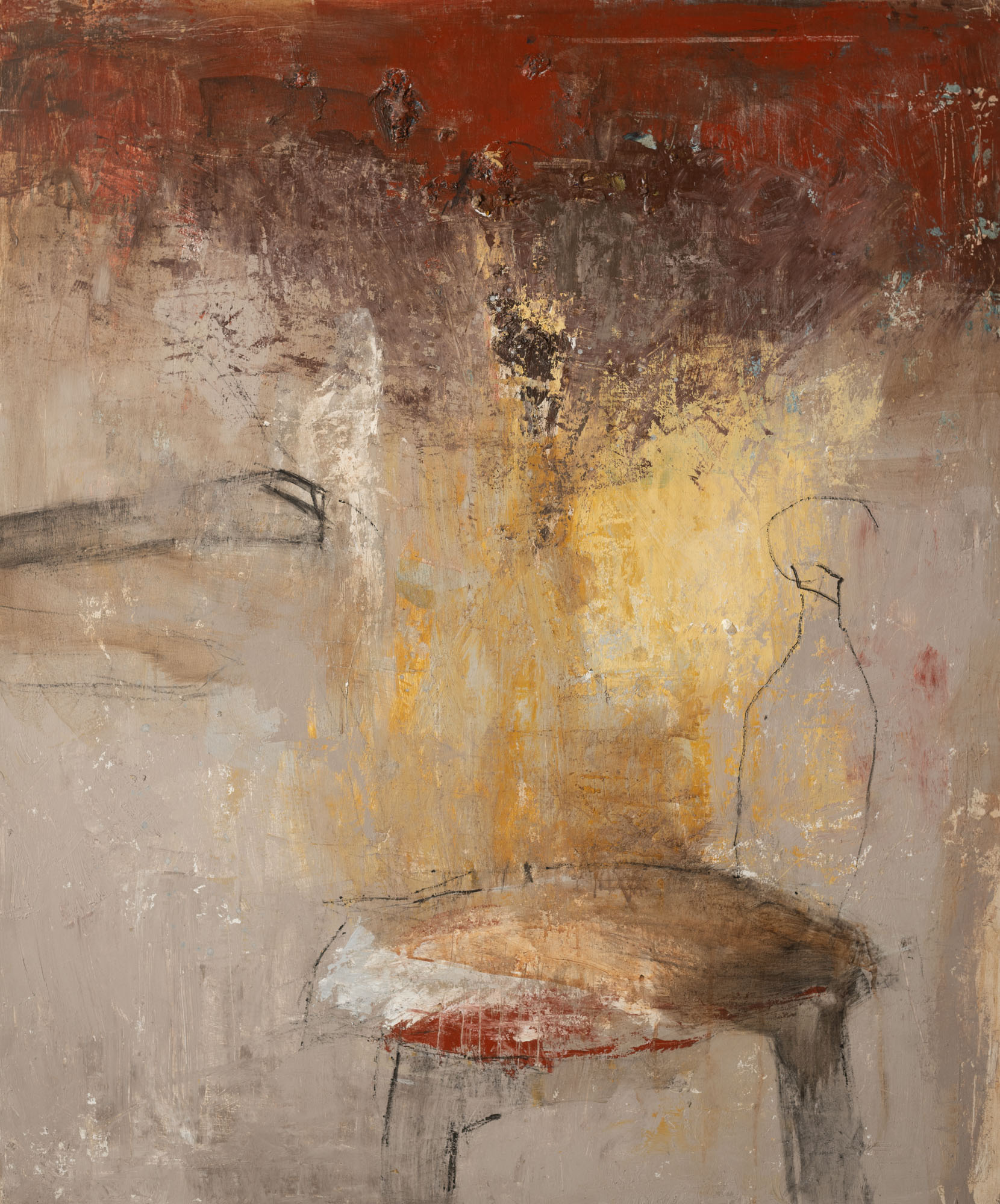 Kunstpoort Je ‘Odyssee’ reeks en ‘Van stof tot steen’ reeks doen me vooral denken aan voorhistorische grotschilderijen of tekeningen, dit door hun textuur en typische aardkleuren, het zijn picturale materieschilderijen. Is het een blij en verrassend weerzien als je terugblikt naar deze vroege schilderijen? Ben je er nog altijd tevreden over?