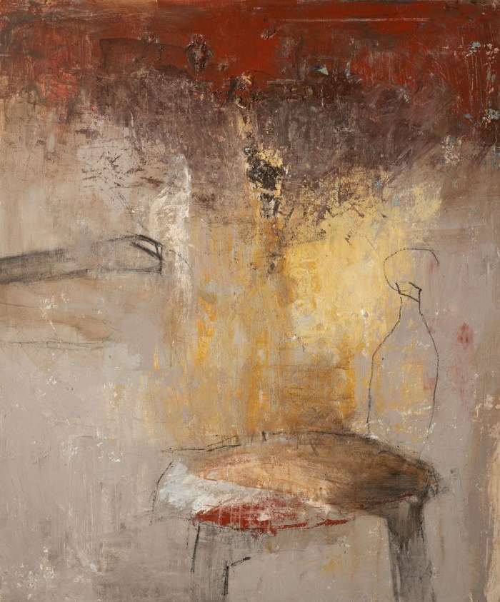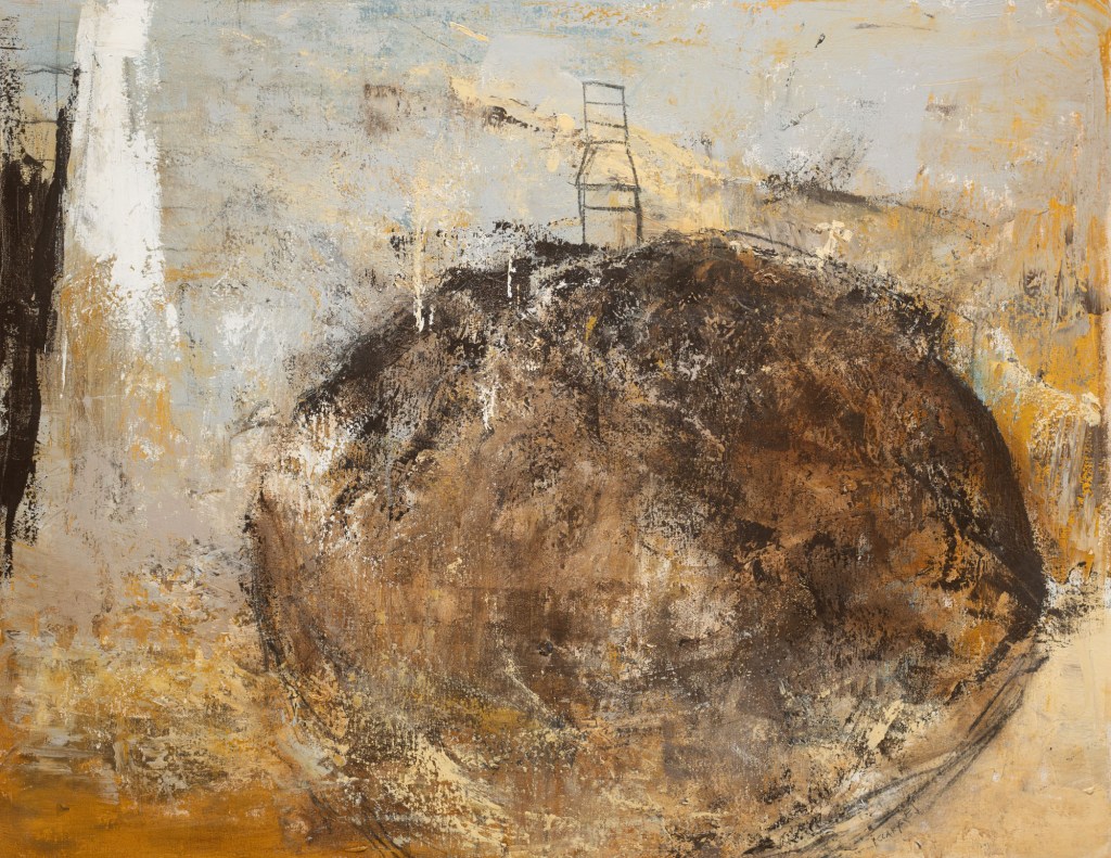 In de ‘Van Stof Tot Steen’ reeks haalde ik mijn inspiratie uit een reis naar ‘Weltshire’ in Zuidoost-Engeland. Het is een streek met talrijke prehistorische sites en imposante stenen constructies, grafmonumenten, magische stenen cirkels, megalieten. Ik was onder de indruk van deze historische locaties, ze hebben iets sacraal, mystiek… en ik begon stenen te schilderen die een eigen leven zijn gaan leiden, ze zweven over het canvas of gaan verstild liggen. In het werk voor de uitnodiging van deze expo (cfr infra) speel ik bv met de tegenstelling van het massieve en organische van de steen met het kwetsbare en lineaire van de stoel erboven op. Dat zorgt voor een extra spanning in dat beeld.