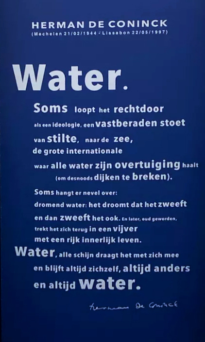 WATER Soms loopt het rechtdoor als een ideologie, een vastberaden stoet van stilte, naar de zee, de grote internationale waar alle water zijn overtuiging haalt (om desnoods dijken te breken.) Soms hangt er nevel over: dromend water; het droomt dat het zweeft en dan zweeft het. En later, oud geworden, trekt het zich terug in een vijver met een rijk innerlijk leven. Water. Alle schijn draagt het met zich mee en blijft zichzelf, altijd anders en altijd water.