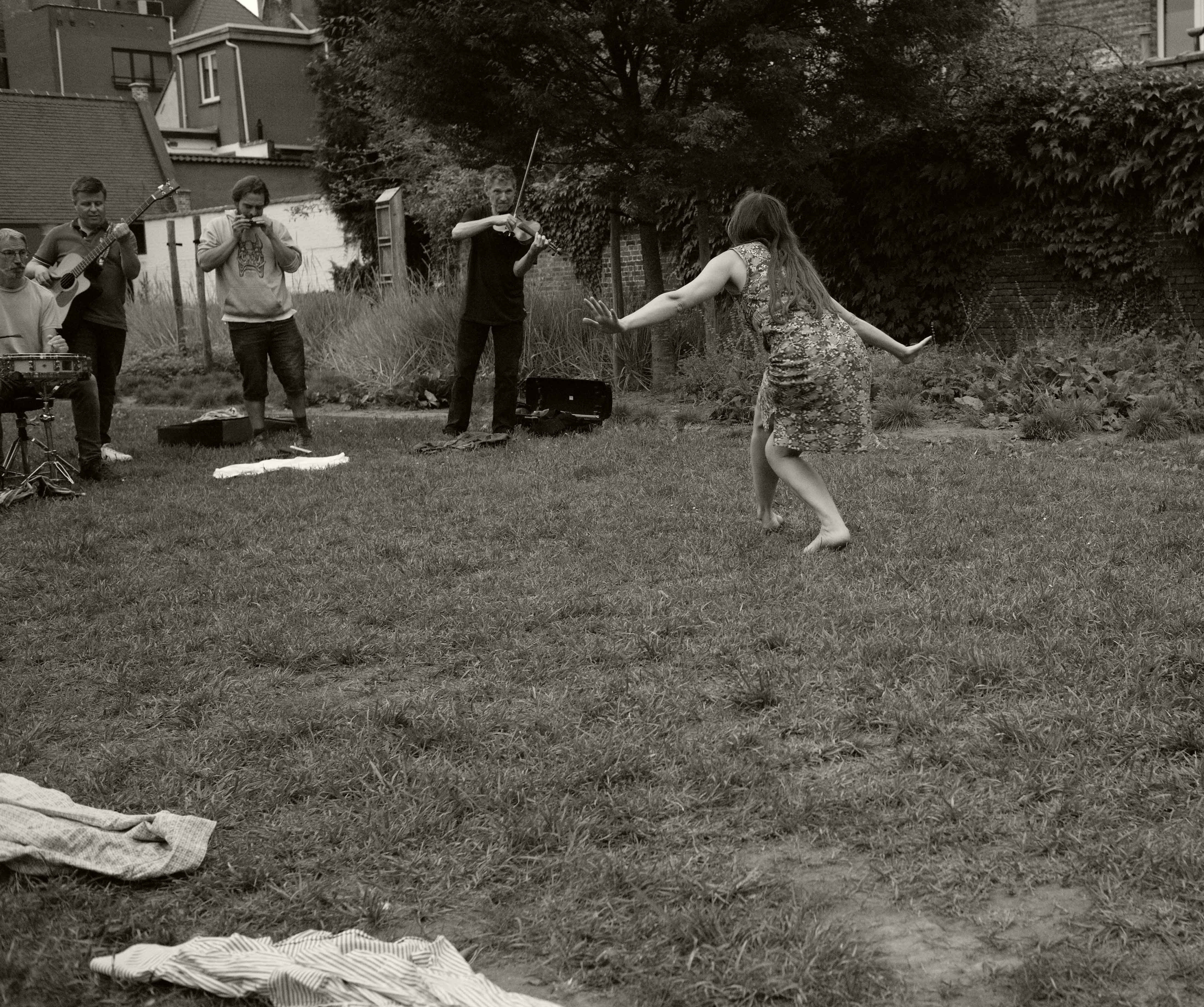 Na de voorstelling ontmoeten we Svitlana, Jozef en Pieter buiten voor de kerk voor een gesprek. Daarbij is één vraag over het ontstaan van de voorstelling genoeg om de drie uitgebreid te laten vertellen. Svitlana vertelt dat het idee vanuit haar is ontstaan. Ze werkt als docent aan het Conservatorium van Brugge. Ze had al langer zin om weer eens iets te creëren. Zoals ze zelf zei “Ik had honger naar creëren”. Toen ze de vraag van Danspunt kreeg of zij iets wilde tonen tijdens Dansstorm heeft ze de ideeën waar ze al langer mee in haar hoofd zat, voorgelegd aan haar man Jozef. Ze werkten eerder samen en om “zichzelf niet te herhalen” hebben ze er goede vriend Pieter bij gevraagd en is het een co-creatie geworden. Een co-productie die al snel overging in een vloeiend creatief proces, van binnenuit. Het idee over ‘loslaten, afscheid nemen’, niet noodzakelijk van erge dingen, maar ook iets als ouder worden, mensen achterlaten, in het geval van Svitlana haar moederland achterlaten, zaken die spelen in ieders leven, zat al langer in haar hoofd. Svitlana heeft haar gedachten en gevoelens over wat ze in haar hoofd had aan de muzikanten voorgesteld en zij zijn samen gaan zitten om haar ideeën om te zetten in muziek. De muziekvoorstellen van Jozef en Pieter bleken al snel aan te sluiten bij wat Svitlana voor ogen had en daarna zijn ze met drie verder gaan werken.