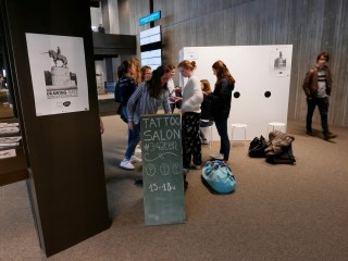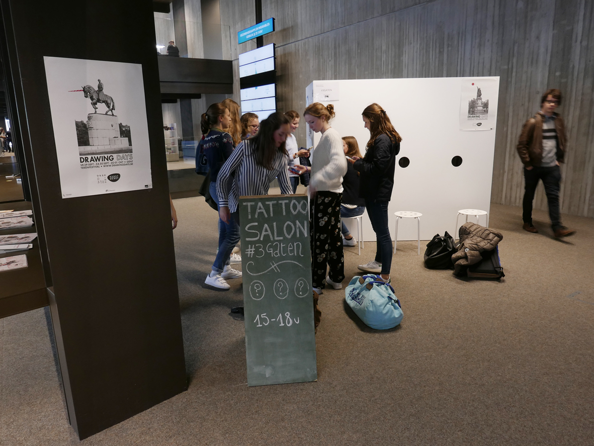 In de Bibliotheek De Krook lieten Bert en mezelf ons graag verrassen. De witte wand met drie gaten konden we niet weerstaan. Achter de wand tekenen er drie tekenaars er drie dagen op los en bezorgen al wie wil een tijdelijk tattoo. Welke tekening? Dit blijft mysterie!