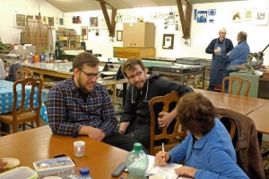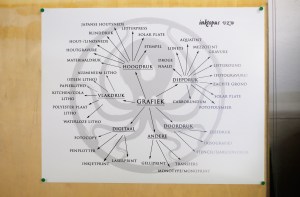 KUNSTPOORT: Hoe is het allemaal begonnen? Hoe zijn jullie op het idee gekomen een grafische werkplaats op te starten? THIJS: Het idee komt van mijn vader Luc die de kennis, de know how heeft. Grafiek is een uit de hand gelopen passie van hem. Hij is de ‘meesterdrukker’ en heeft de microbe aan ons, zijn 2 zonen (Thijs en Bram) doorgegeven. We zijn mee gestapt in zijn verhaal en samen runnen we op vrijwillige basis het atelier. Inktopus is een vzw. Bram en ikzelf werken fulltime (Stijn als regisseur bij de VRT, Bram maakt animatiefilms). Al onze vrije tijd gaat uit naar het atelier. Ieder heeft zo zijn specialiteit en beheerst bepaalde druktechnieken. Ook mijn ma geeft hier workshops o.a. boekbinden, papier scheppen, papier marmeren. KUNSTPOORT: Hebben jullie bewust voor Gent gekozen als locatie? THIJS: Inderdaad Gent is een bewuste keuze. Gent is een centrum van en voor kunst en leek er het meest klaar voor, vooral ook voor de nieuwe ecologische manier van werken namelijk non-toxisch. Bij de start huisden we in Gentbrugge, in een kerk. Nu hebben we hier onze stek in een ex magazijn voor elektriciteit materiaal, heel lang geleden was hier nog een metaalfabriekje. Ons huis was uiteraard te klein omdat we groot materiaal wilden kopen. LUC: We konden een HEIDELBERG typo drukpers van de school Don Bosco, Halle op de kop tikken. Anders ging die naar het schroot. KUNSTPOORT: 100% non-toxische, milieuvriendelijke grafiek is dat wel mogelijk? THIJS: Dit is onze filosofie, we willen punt één open staan voor iedereen en punt twee 100% milieuvriendelijk werken. Daarom hebben we gekozen enkel met die druktechnieken te werken die 100% non-toxisch zijn, op waterbasis. Bij steenlitho lukt dit nog niet daarom zit steenlitho ook niet in ons aanbod. KUNSTPOORT: Wie maakt er vooral gebruik van het atelier? THIJS: Ons publiek is zeer divers van pas afgestudeerde studenten, kunstenaars…tot gepensioneerden… Velen vinden de weg naar INKTOPUS. Het voordeel van ons atelier is dat je geen voorkennis nodig hebt. Via workshops wordt er voldoende bagage meegegeven zodat je aan de slag kunt. Zo kan je een workshop volgen en later een geboorte- of communiekaartje, uitnodiging… drukken. LUC: We hebben een 25 tot 30 tal leden die hier regelmatig komen werken. Zo ontstaat een hechte kring, een soort groepsgevoel met een uitwisseling van ideeën als gevolg. Belangstellenden komen van overal, van ver buiten Gent, Mechelen, Sint-Niklaas, Limburg…. De reden? We zijn uniek in Vlaanderen.