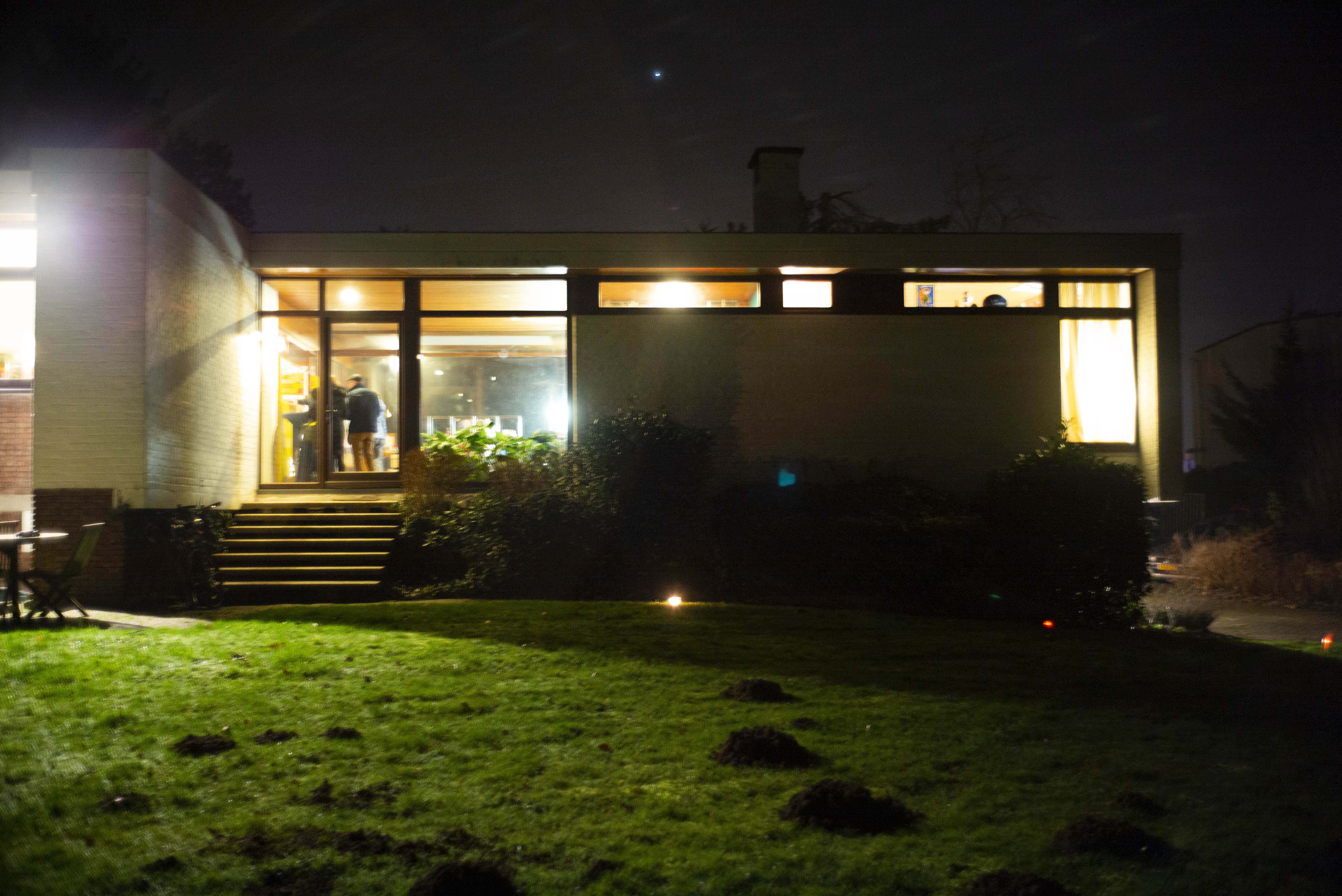 Bij aankomst is het donker en zie je alleen een muur van hoge bomen. Ik volg een pad. Juist voorbij de bomen zie ik een typische moderne woning, gebouwd in de jaren 60, met simpele rechthoekige en strakke lijnen. De kaarsen die de weg naar de ingang moeten tonen zijn niet direct zichtbaar. Ik neem de trappen rechts van me en ontdek het hele huis met de grote ramen en het warme licht. Je voelt dat je welkom bent. Terug het paadje naar beneden, volg ik nu de kaarsen tot aan de trappen van de inkomdeur. Het gevoel blijft hetzelfde. Jij bent geen gewone toeschouwer van een Jazzconcert, je bent een gast.