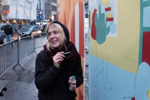 Ik kende Rocio Alvarez, ze is een vriendin van vrienden. Ze maakt ook muurschilderingen, animatievideo’s, grafische afbeeldingen … ongeveer hetzelfde soort projecten als ik. Toen ik het te schilderen oppervlak en het tijdschema zag, dacht ik erover om hulp te vragen omdat het te lang zou duren in mijn eentje en dan is het leuker om het samen te doen. Ik vroeg haar of ze interesse had om bij mij te komen schilderen. Ze heeft geaccepteerd. We organiseerden ons in functie van haar vrije dagen. Het viel allemaal heel gemakkelijk op zijn plaats. Het is iets dat ze graag doet, schilderen, .. Op het moment dat ik haar vroeg om me te helpen schilderen, voelde ik me een beetje ongemakkelijk. Voor iemand zoals zij die tekent en muurschilderingen maakt volgens haar eigen verbeelding, die een identiteit heeft … In het begin was ik een beetje … “verdorie … het zal voor haar niet zo creatief zijn, het zal meer van technische of uitvoerende aard zijn”. Ze was erg enthousiast en ze houdt van schilderen, dus dat was tof. Het is niet haar stijl, het is anders. Het ging goed – heel goed -, ze heeft me veel geholpen, ze heeft meer ervaring dan ik, ze weet wat ze moet doen. Ik heb veel advies van haar gekregen.