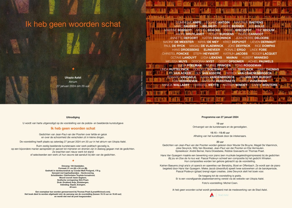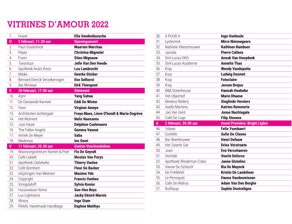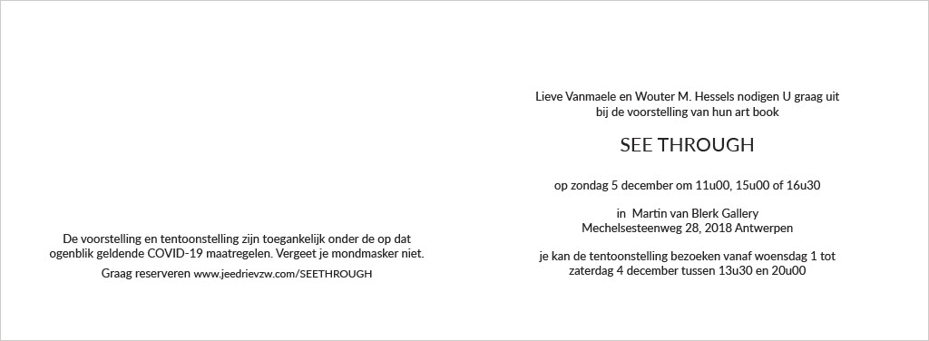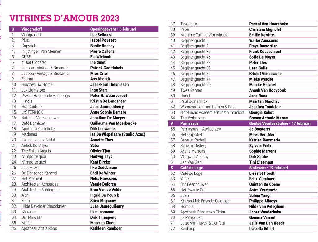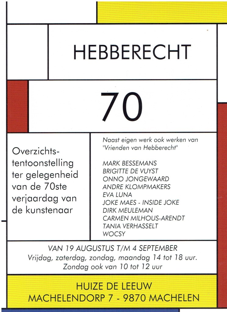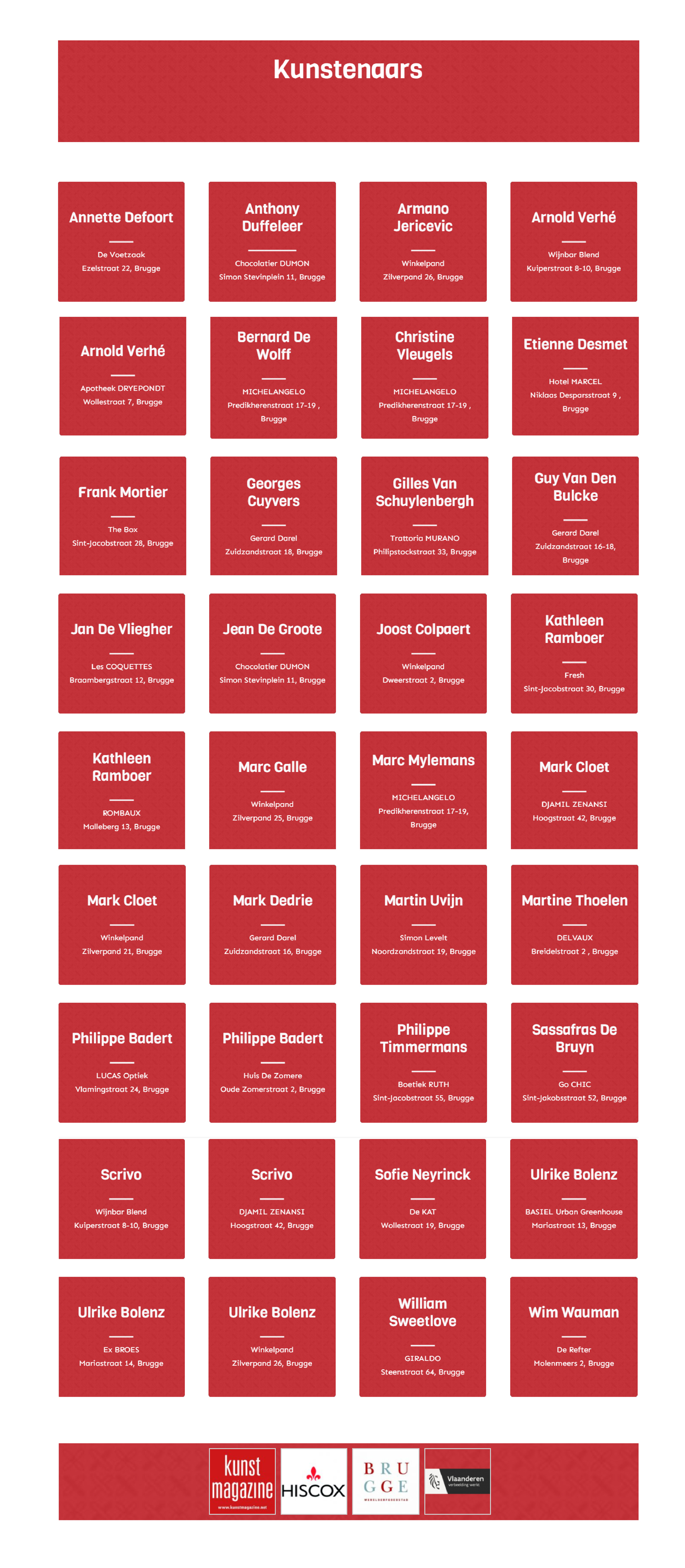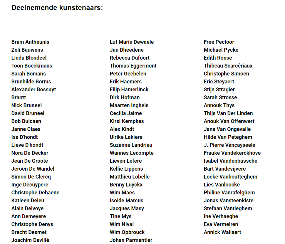 Chris Hubrecht, Phi, Jan Delestinne, Sylvie Janssens, Hilde Van Impe, Tessa Groenewoud, Topo Copy, Okke Vanbrabant, Kathleen Ramboer, Colette Cleeren, Eddy De Buf, Tom Van Nevel, Isa D’hondt,